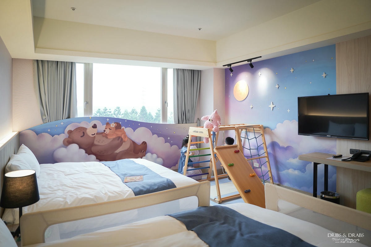 小熊主題房有兩種房型 (隨機分配房型),星空款(上圖)和森林款(下圖),格局設備都一樣,只有彩繪牆和搭配的床鋪色系有些微不同。我們入住的是星空款,晚上關燈時牆上的星星會發出淡淡的螢光,森林款可參考下方幾張照片。