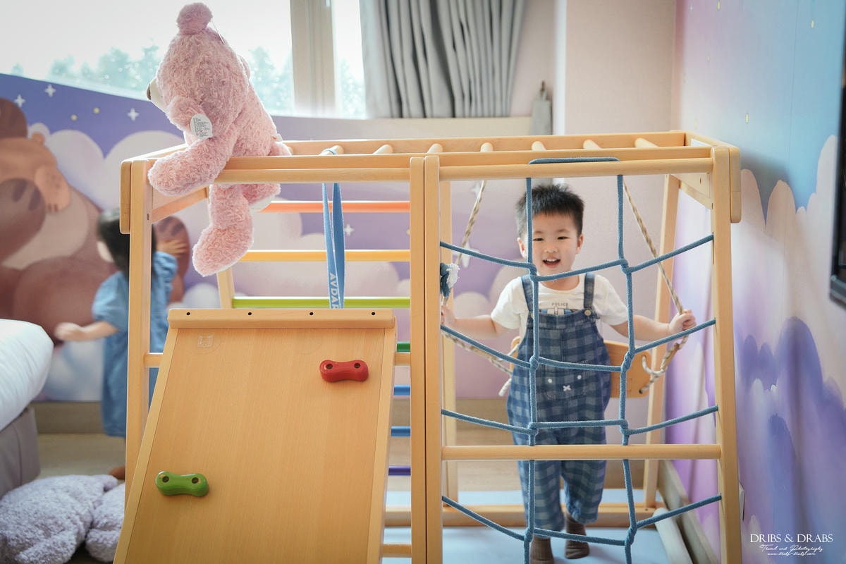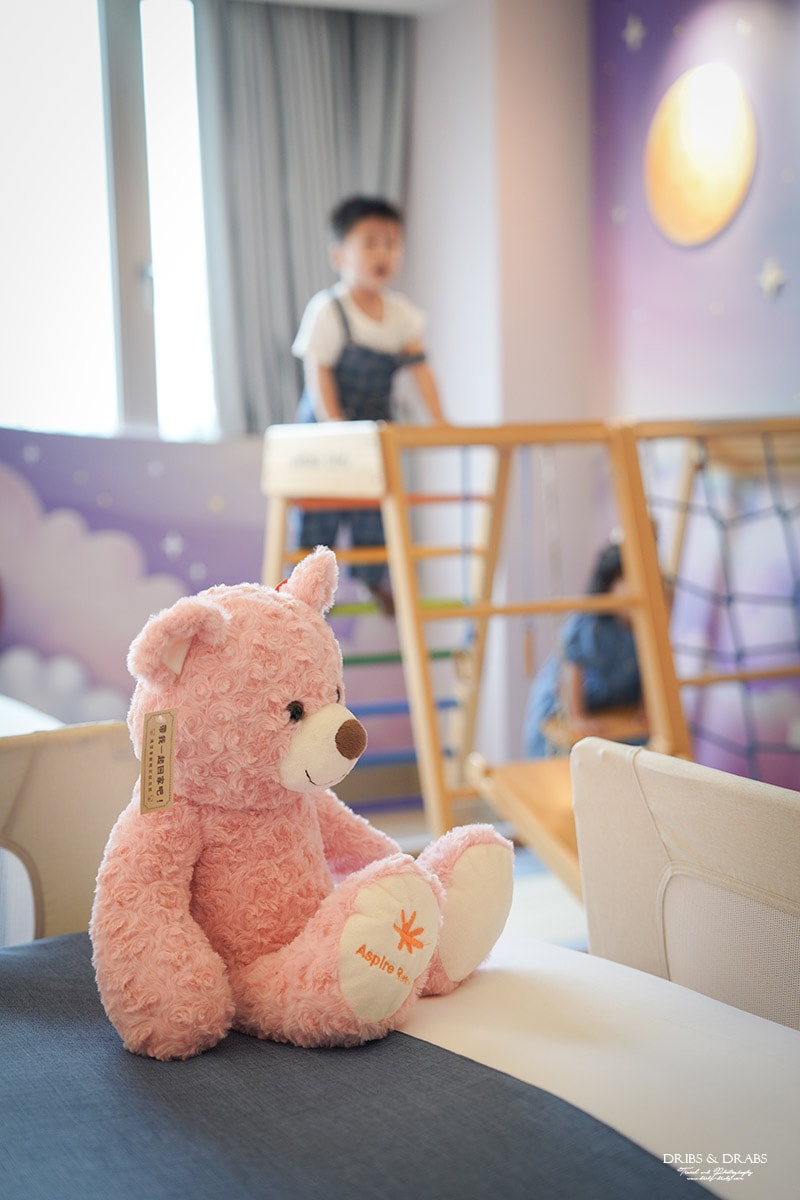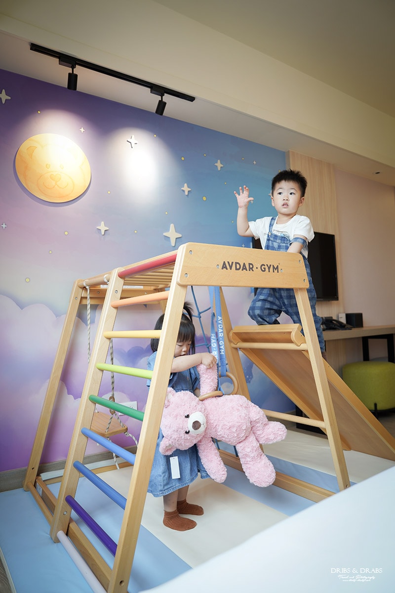 一踏入房間,知知看見床上擺著可愛的熊熊,立刻衝過去又抱又捏;光光則緊隨其後,果不其然,接著上演了每日例行公事:搶玩具和吵架。所幸房內擁有豐富的遊樂設施,成功轉移了他們的注意力,不一會兒,他們有時翻閱繪本、有時在遊戲區自由探索,那認真又專注的模樣,心都要被融化了。
