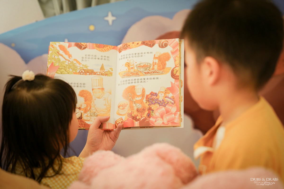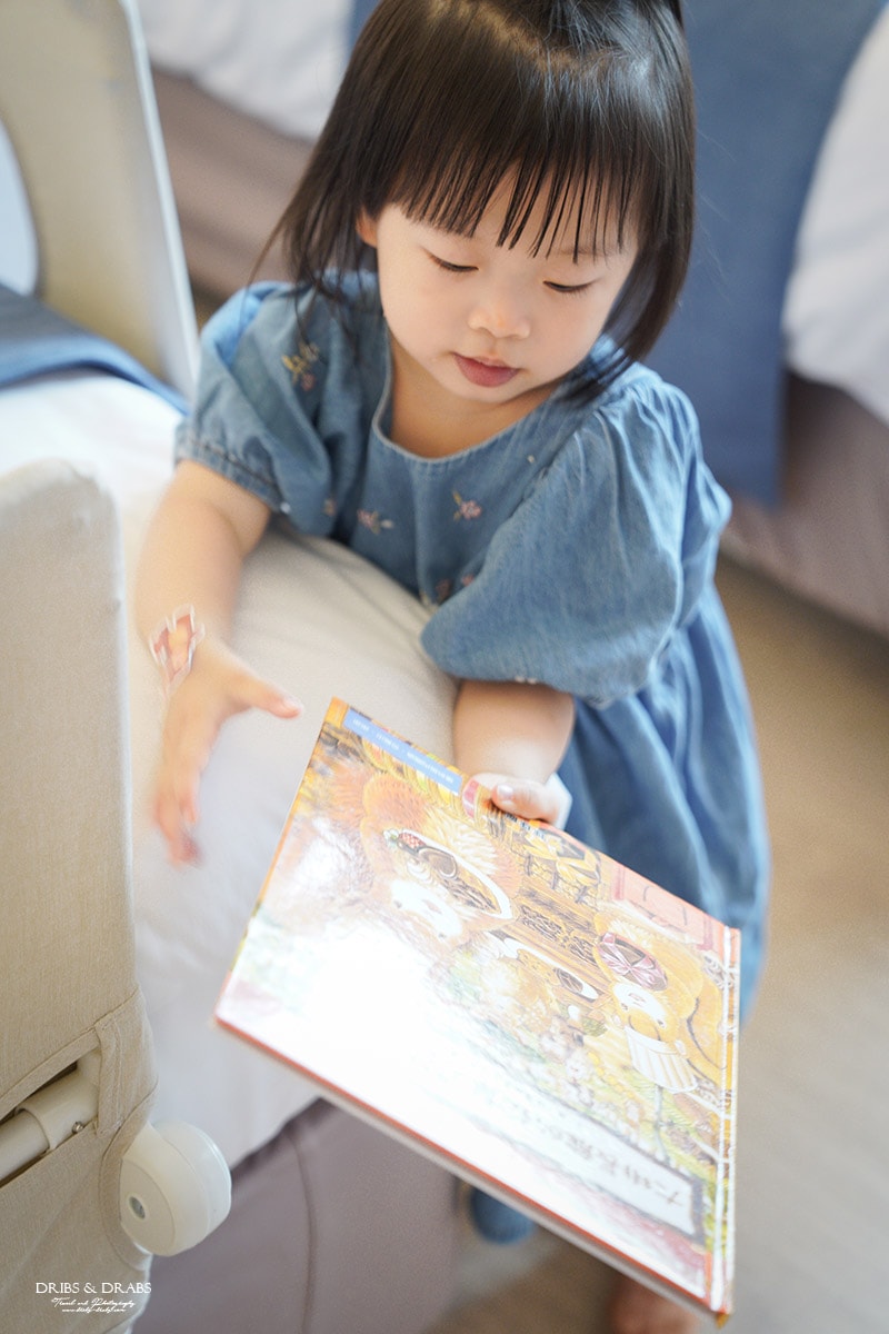 每間小熊主題房都會為孩子精選一本繪本,當天拿到的是福澤由美子繪製的「大排長龍」系列其中一本,家裡已有許多這系列的書籍,光光和知知對書中出現的小動物早已暸若指掌,下午便自己窩在床上讀得津津有味呢!到了夜晚,是我們一家的繪本故事時光,看著他們安靜地依偎在身邊、專注地聆聽每一段情節,這份溫柔的陪伴,是旅行中最珍貴的片刻。