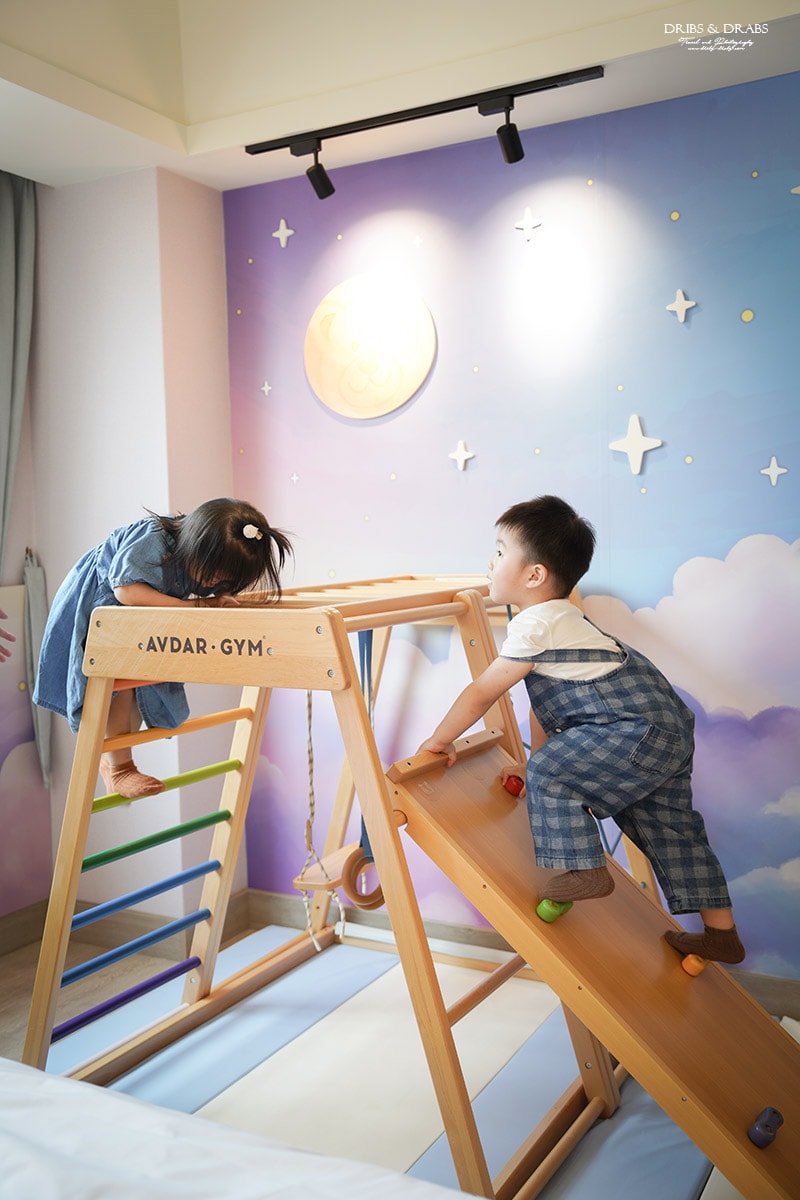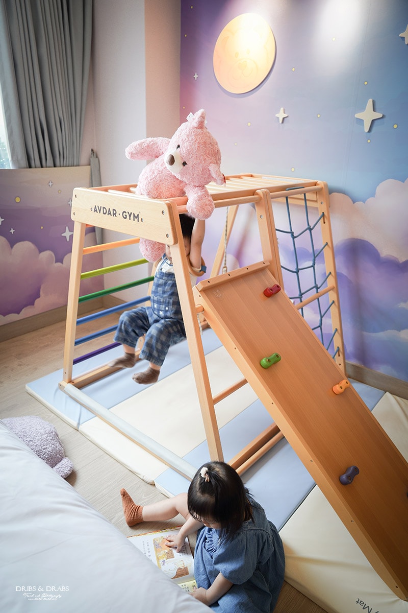 房內設置了 AVDAR 櫸木攀爬架,打造一個多功能的遊戲天地。斜板一面是攀爬架,另一面則為溜滑梯,此外還結合了鞦韆、單槓與樓梯等設計,讓孩子們能在室內盡情放電。光光迷上吊單槓,把這裡當作健身房,還沒等到晚上,他早已精疲力盡,直接躺平睡著,可說是放電放得非常徹底!