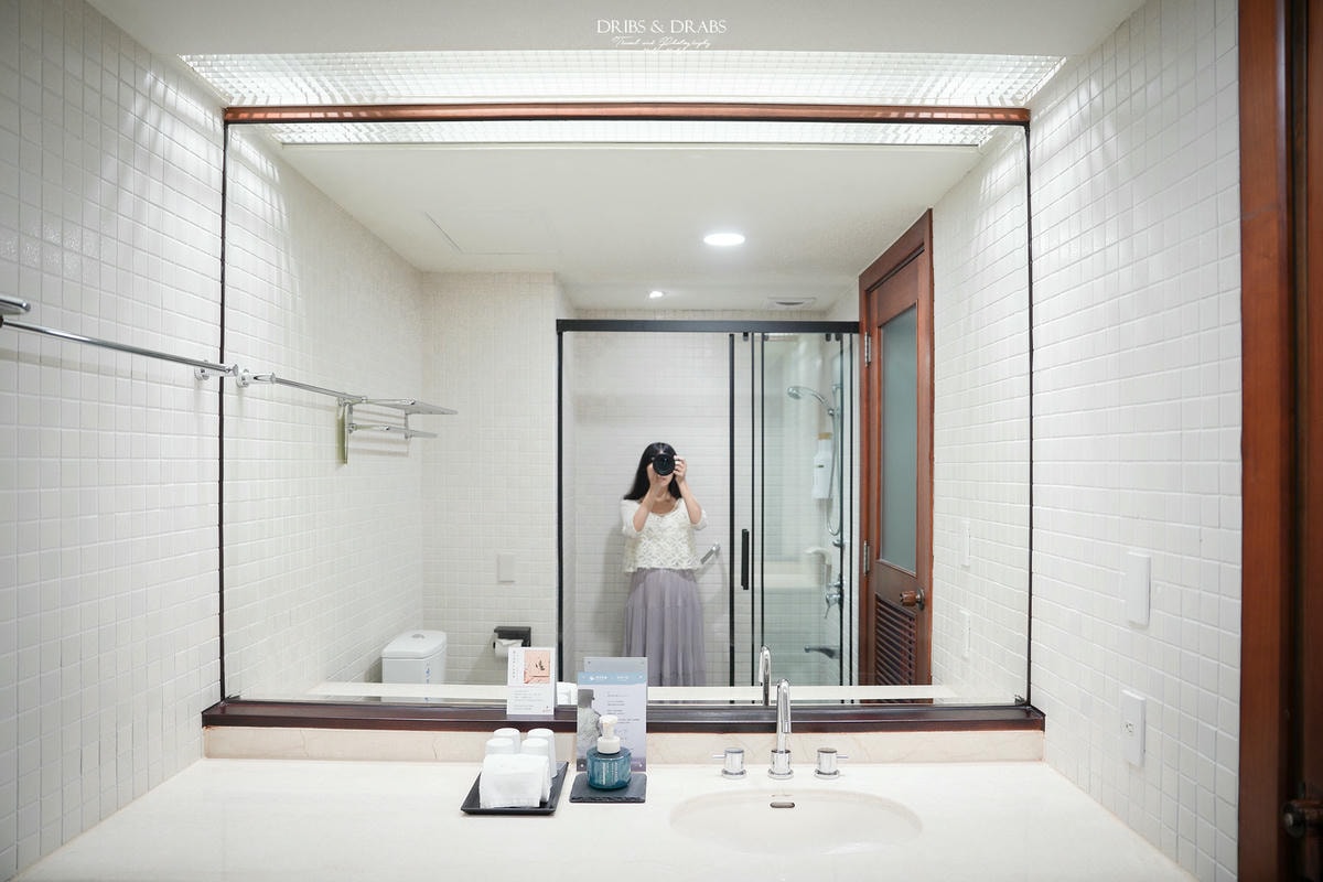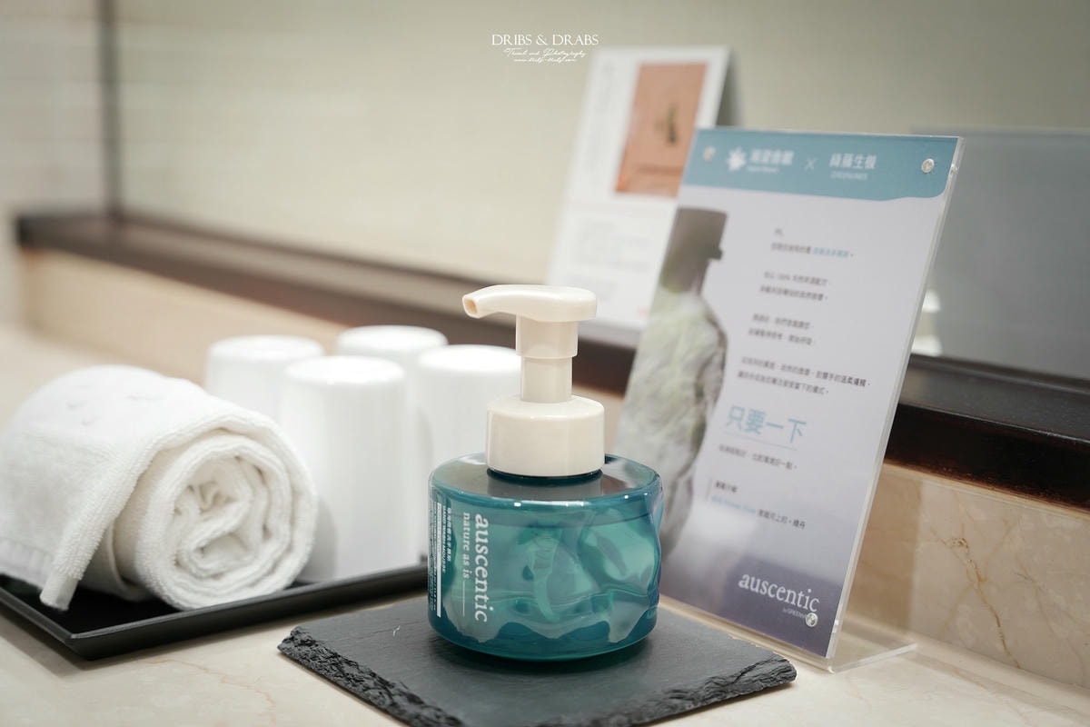 衛浴空間為乾濕分離設計,明亮清新,整體設備嶄新整潔,應是近期才剛翻修過。雖然近年因應政策,多數旅宿已不主動提供一次性備品,但渴望會館早在政策實施前,便主動響應環保,展現出對節能減碳的重視,讓人由衷讚賞。盥洗用品選用環保品牌歐萊德的洗髮精與沐浴乳,而我特別喜歡洗手台上的 auscentic 洗手慕斯,成分100%萃取自大自然,綿密細緻的泡泡伴隨淡雅森林香氣,洗手時彷彿也洗去了疲憊,心情也不自覺地輕盈起來。