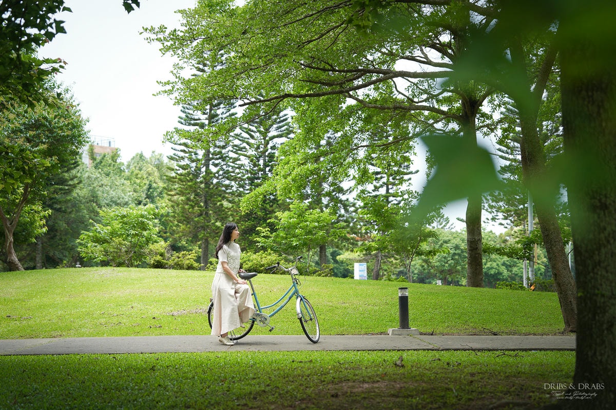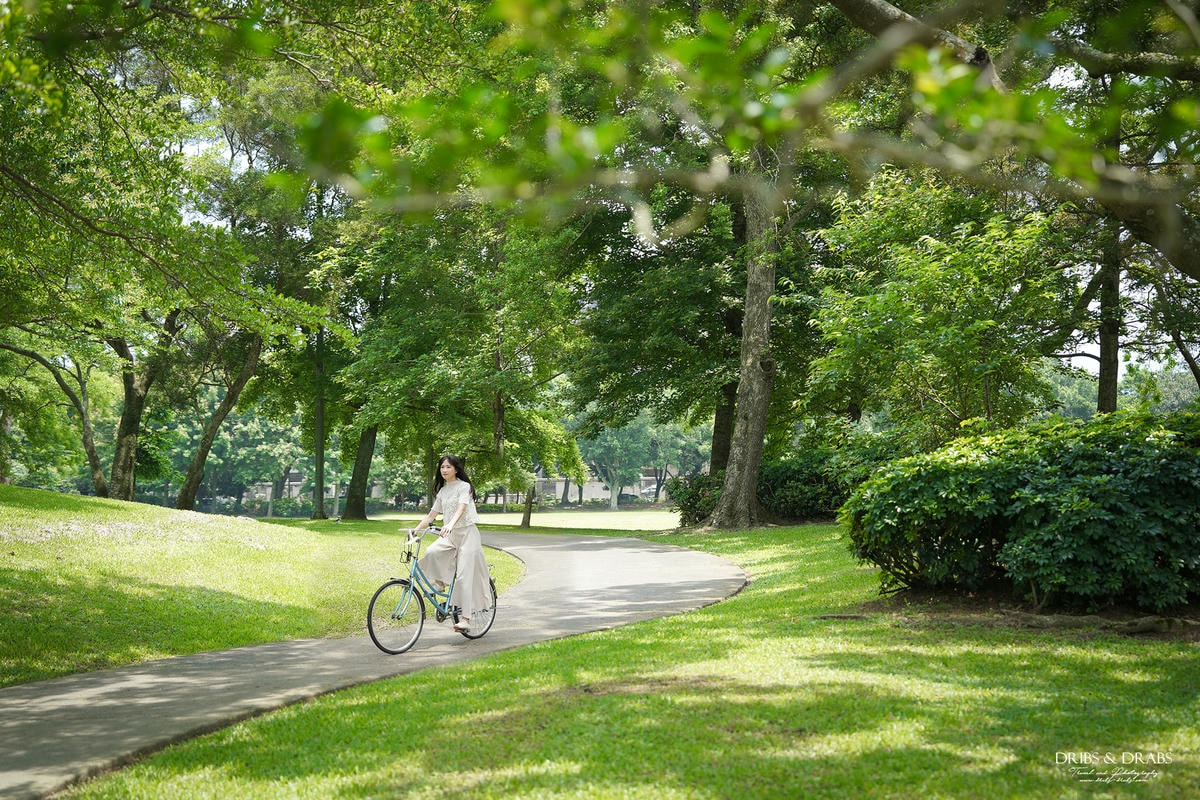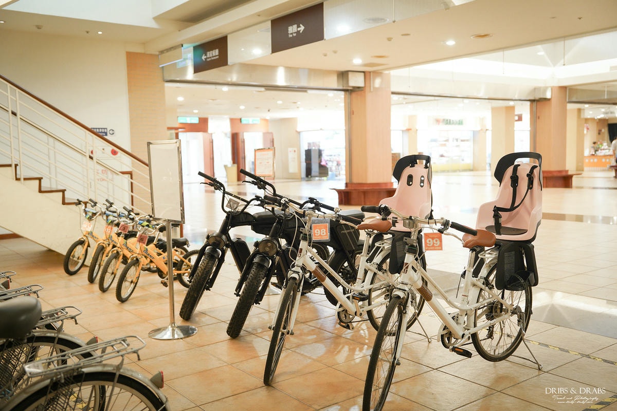 除了成人腳踏車外,館方還貼心準備了親子腳踏車、兒童腳踏車,以及可付費租借的電輔車,滿足不同年齡層的騎乘需求。那天我們借了親子腳踏車,載著光與知在公園中悠閒騎乘,再至渴望園區周邊逛逛,騎著騎著,知竟然在車上睡著了!