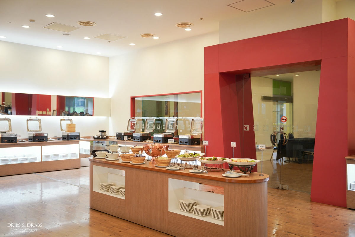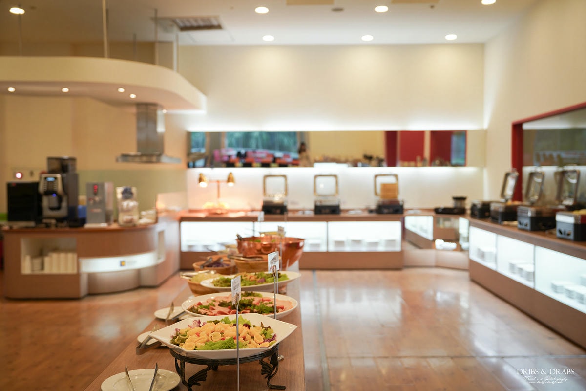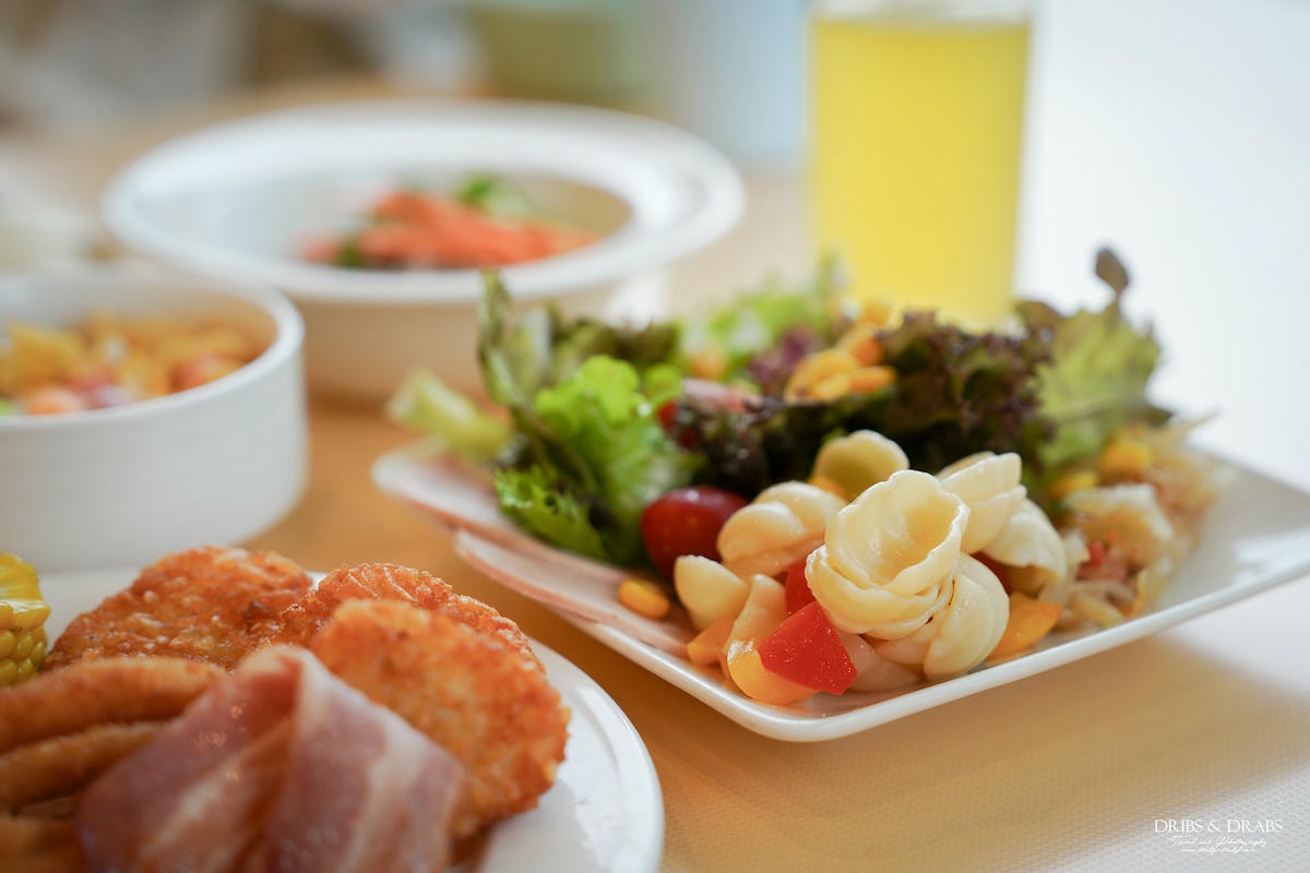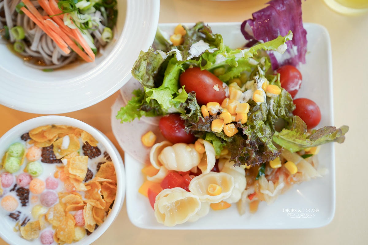 住宿早餐安排在一樓的餐廳享用,餐廳一側為圓弧形的落地窗,自然光灑落室內,窗外綠意盎然的公園景緻彷彿也成了用餐的一部分,視野清新宜人,讓人一早就有好心情。早餐為自助式供應,餐點選擇豐富,口味清爽養生。我特別喜歡他們的沙拉系列與蕎麥冷麵,冰涼爽口,適合現在這樣微熱的季節享用,清爽又開胃。