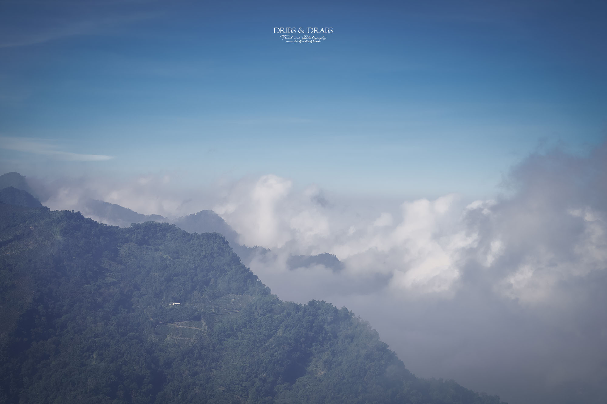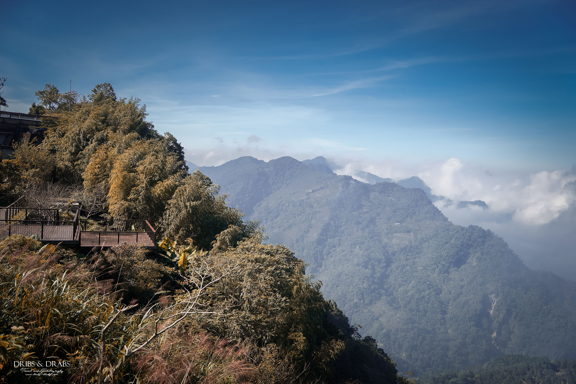 位在阿里山公路上的二延平步道,是阿里山最受歡迎的登山路線之一。登山口交通便利,設有公車直達,非常適合安排一日輕旅行。步道最大的魅力在於能一次欣賞到茶園、雲海與日落等多重景緻,被譽為「阿里山最夢幻的天空步道」。當天來訪時,早晨還起了大霧,原本對於天氣有些失落,沒想到享用早餐後太陽漸漸露面,讓我看見了藍天下阿里山絕景。來到二延平步道時,已是豔陽高照的天氣,上方兩張圖是在登山口看見的景色,那時就知道山頂一定出大景!