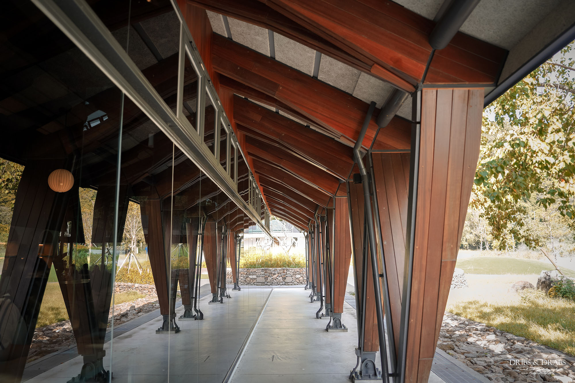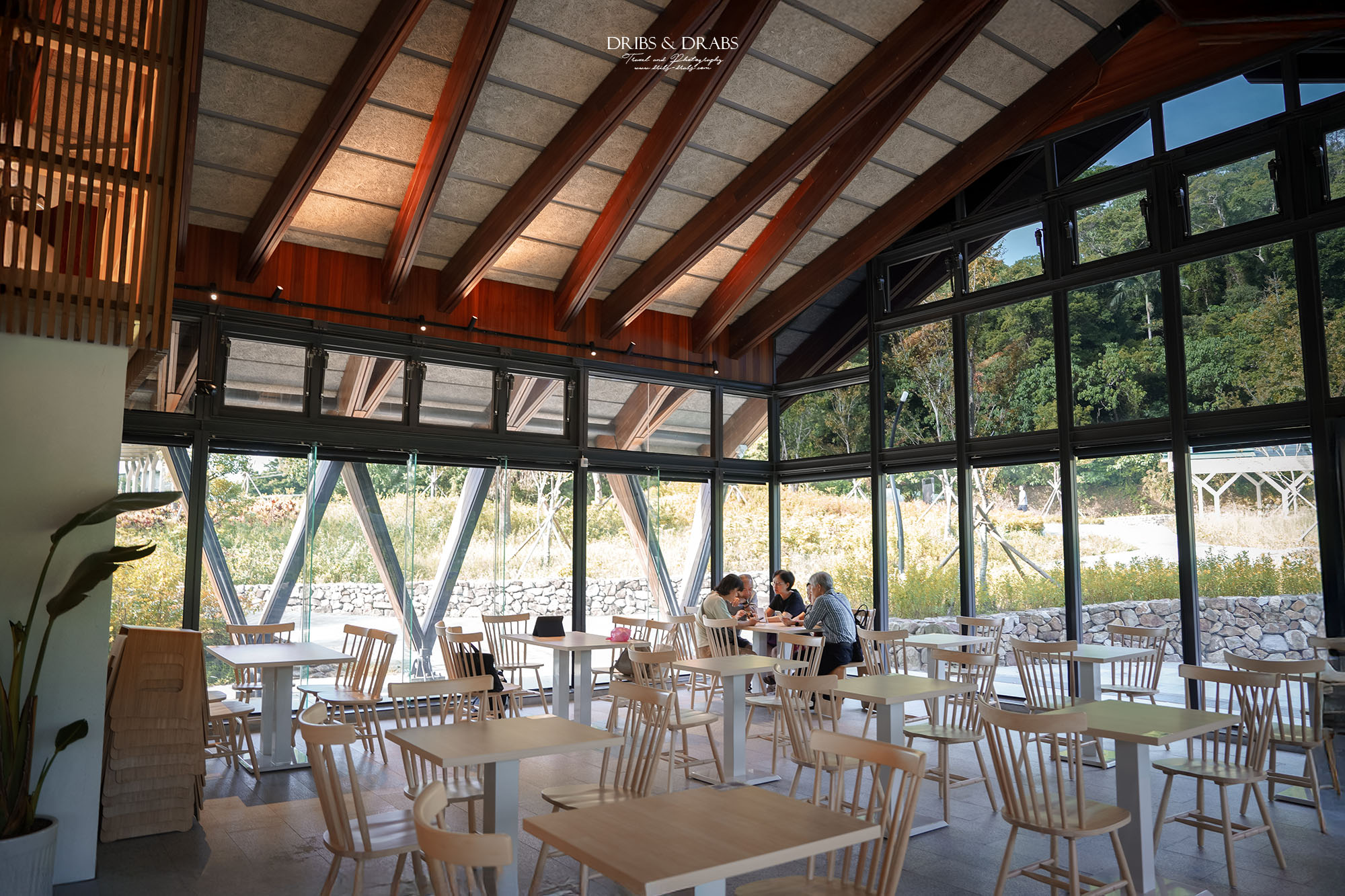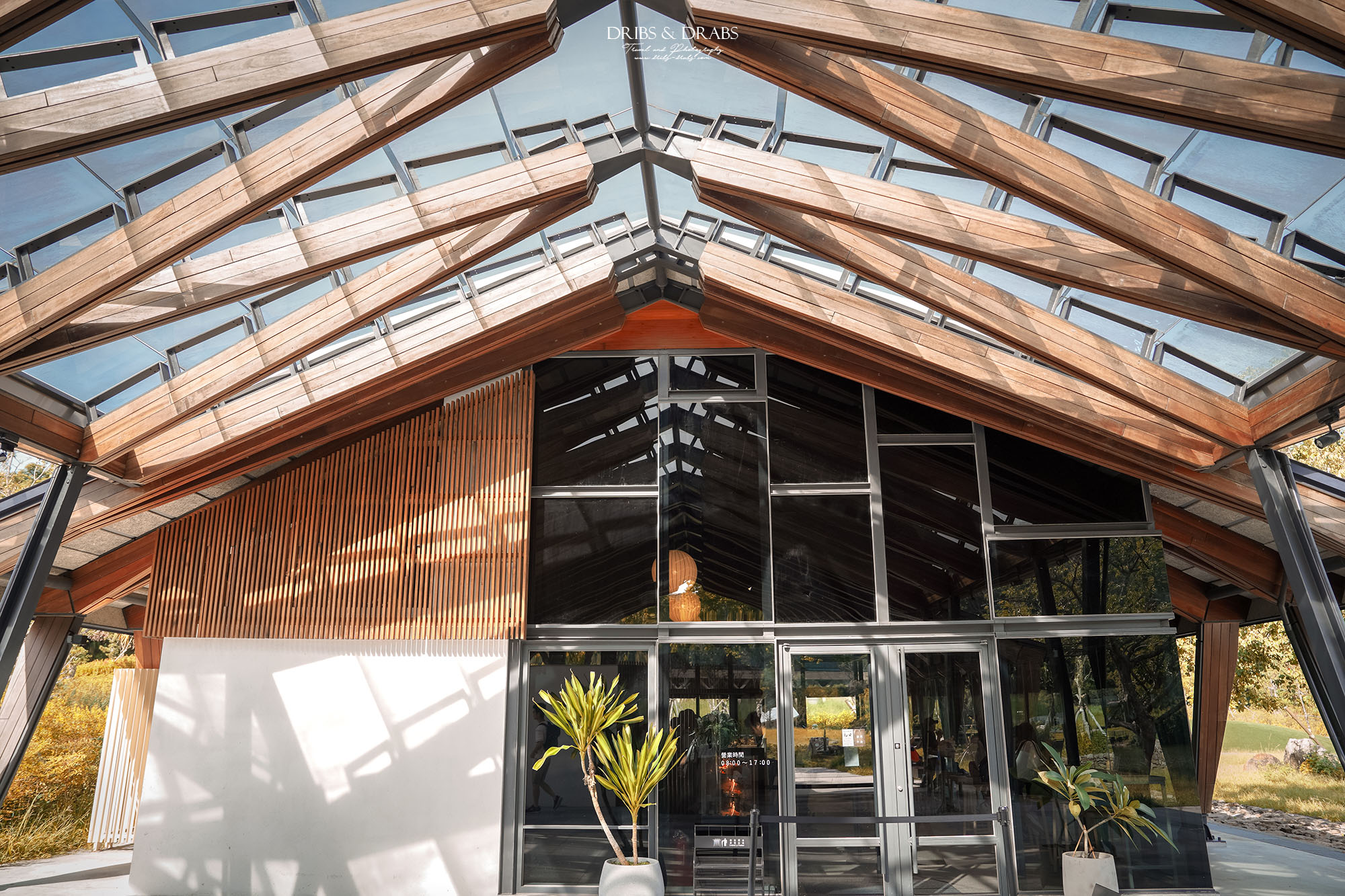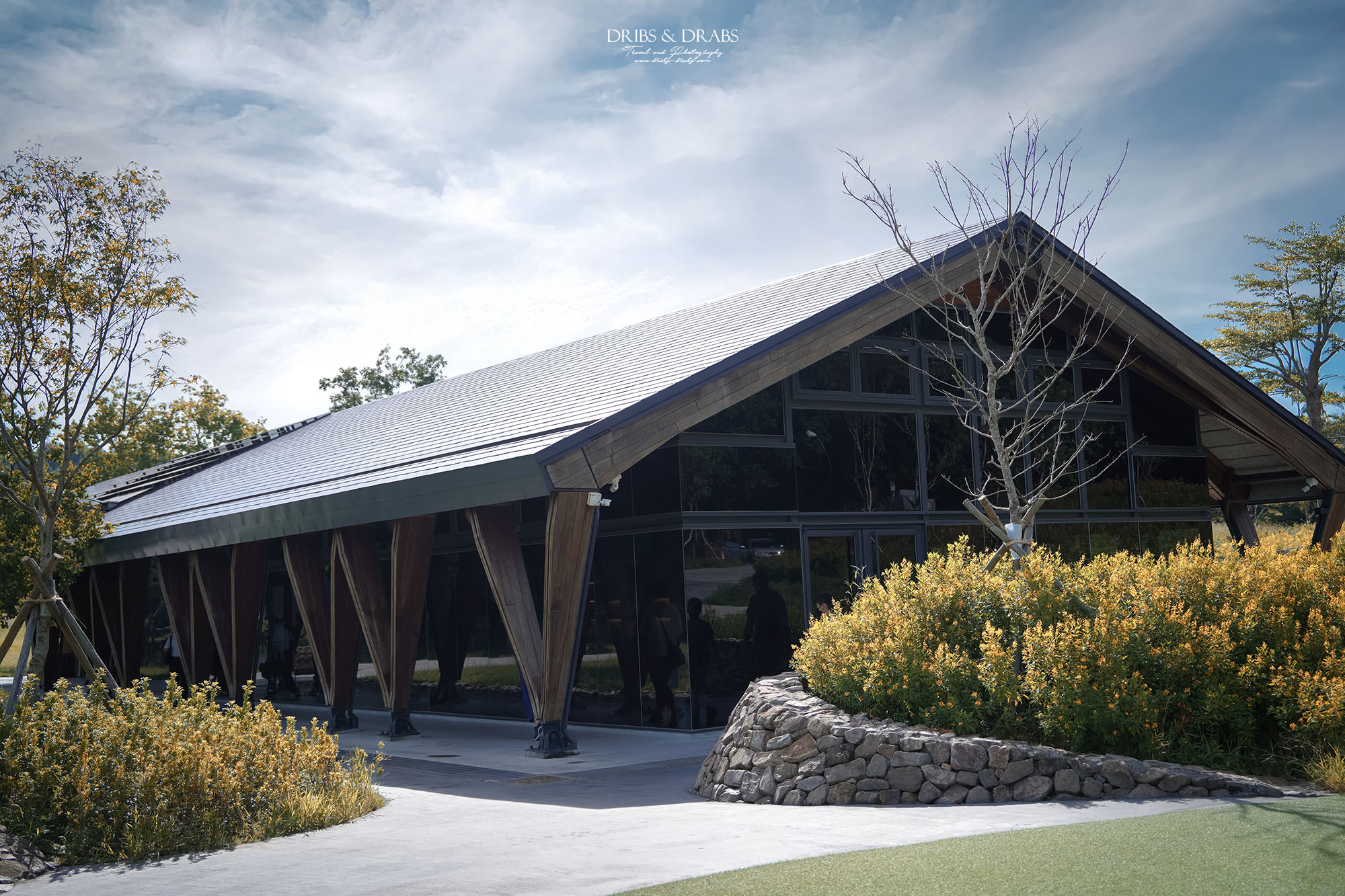 享用完咖啡與甜點後,我們到戶外散步。茶屋的落地玻璃窗經過特殊處理,從外頭望去宛如一面鏡子,既美觀又能保護裡頭客人的隱私。草坪與步道都整理得相當乾淨,還看見清潔人員仔細地洗刷著地面,能感受到這座園區在維護上的用心。
