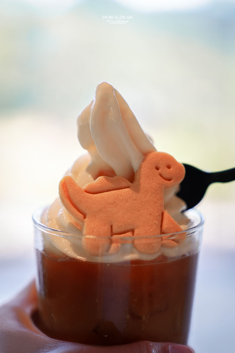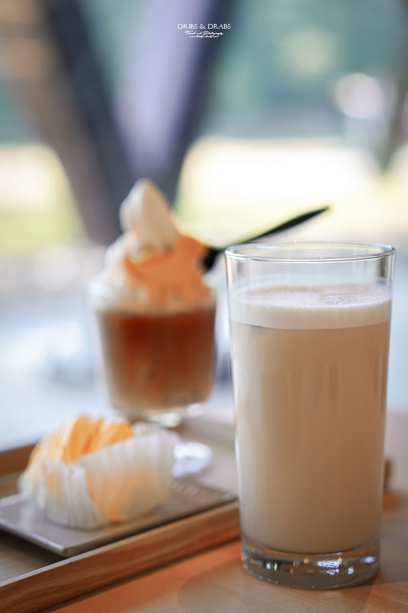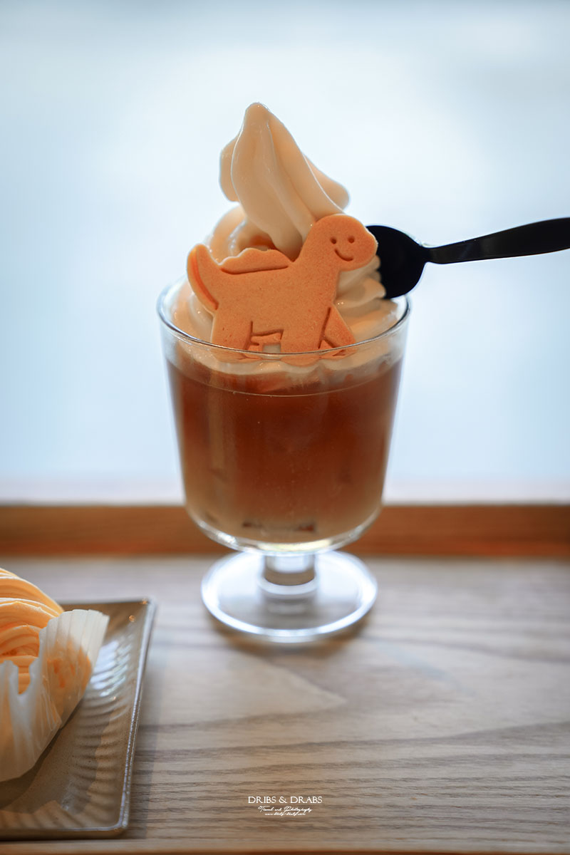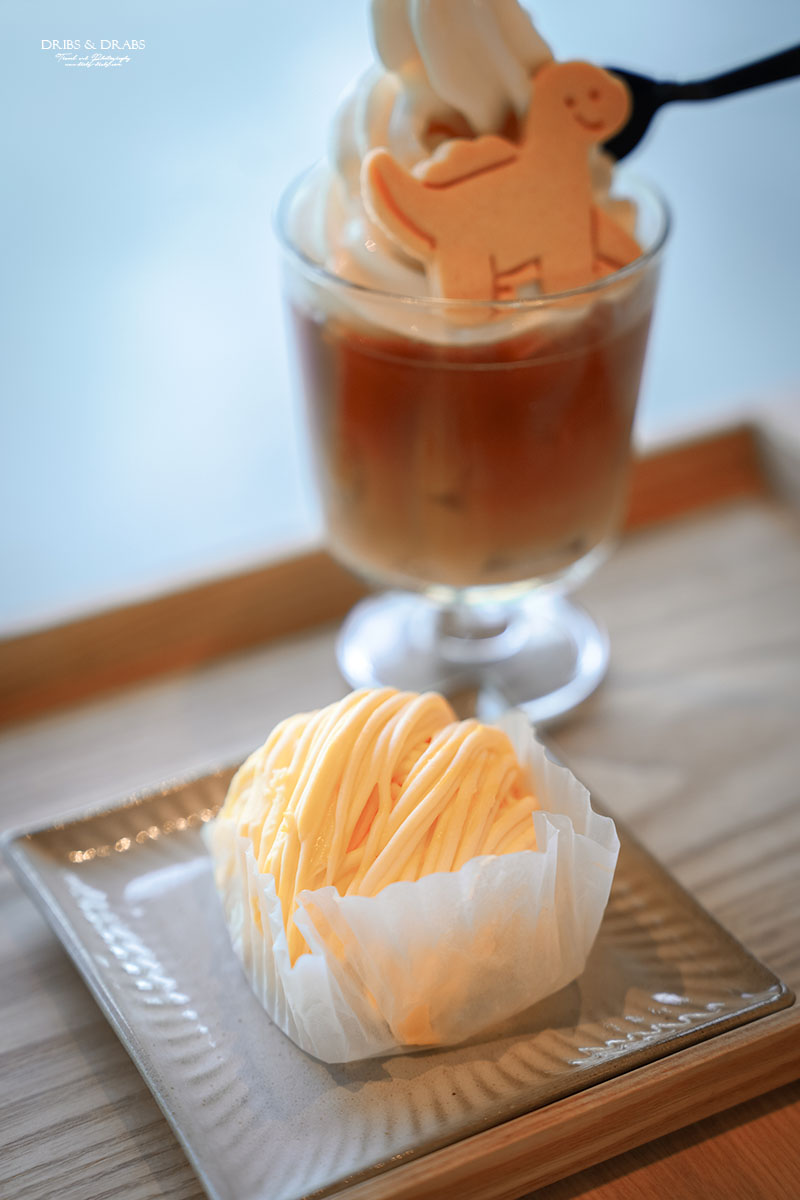 我們點了漂浮冰紅茶、貴妃烏龍鮮奶茶、檸檬蒙布朗與手工餅乾,每樣都頗有水準。最讓人驚喜的是漂浮冰紅茶,清爽的紅茶上頂著香濃鮮奶冰淇淋,還插著一塊可愛的恐龍餅乾。那隻恐龍名叫「悠悠龍」,正好呼應「龍潭湖畔悠活園區」的名字。