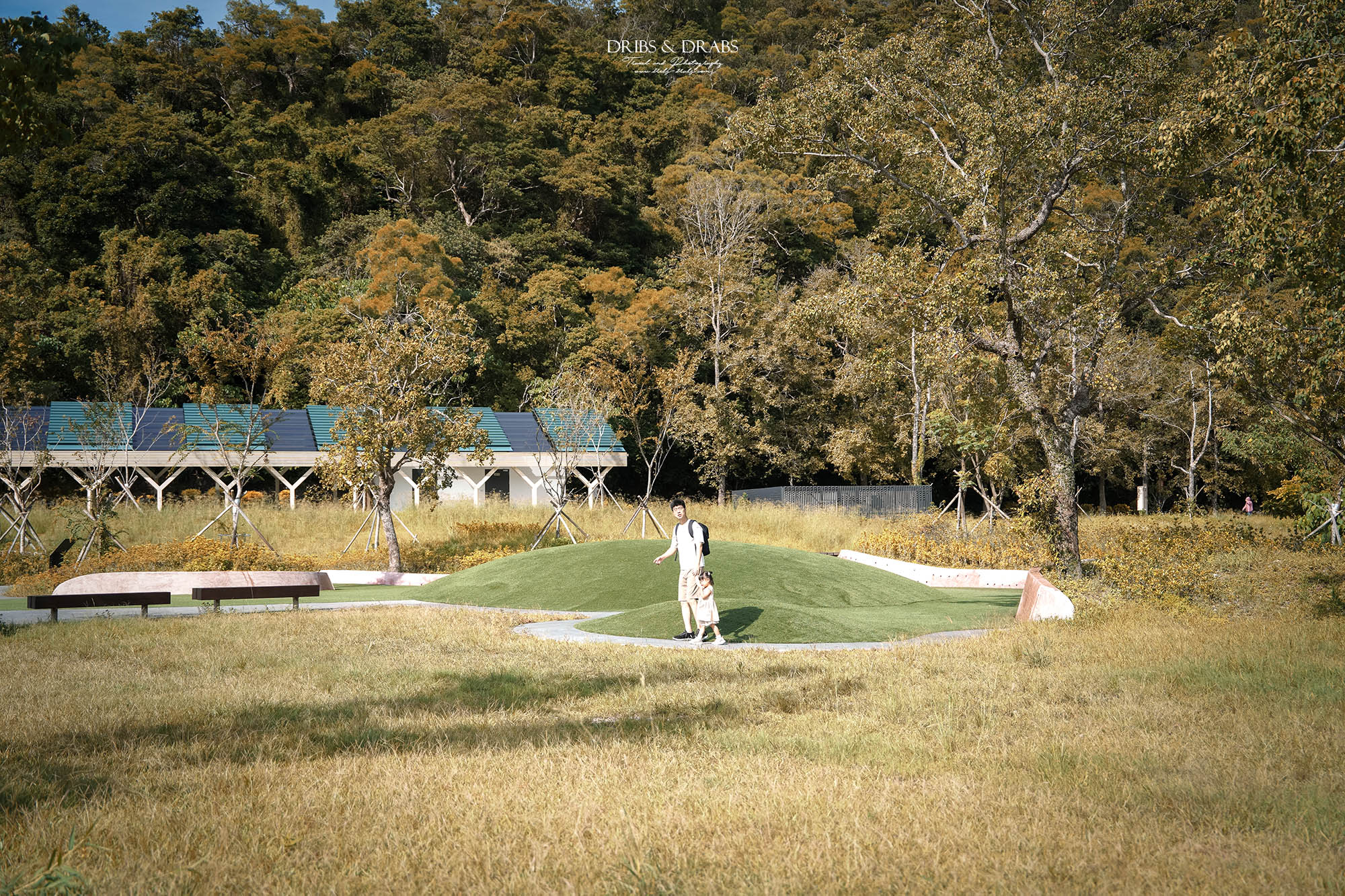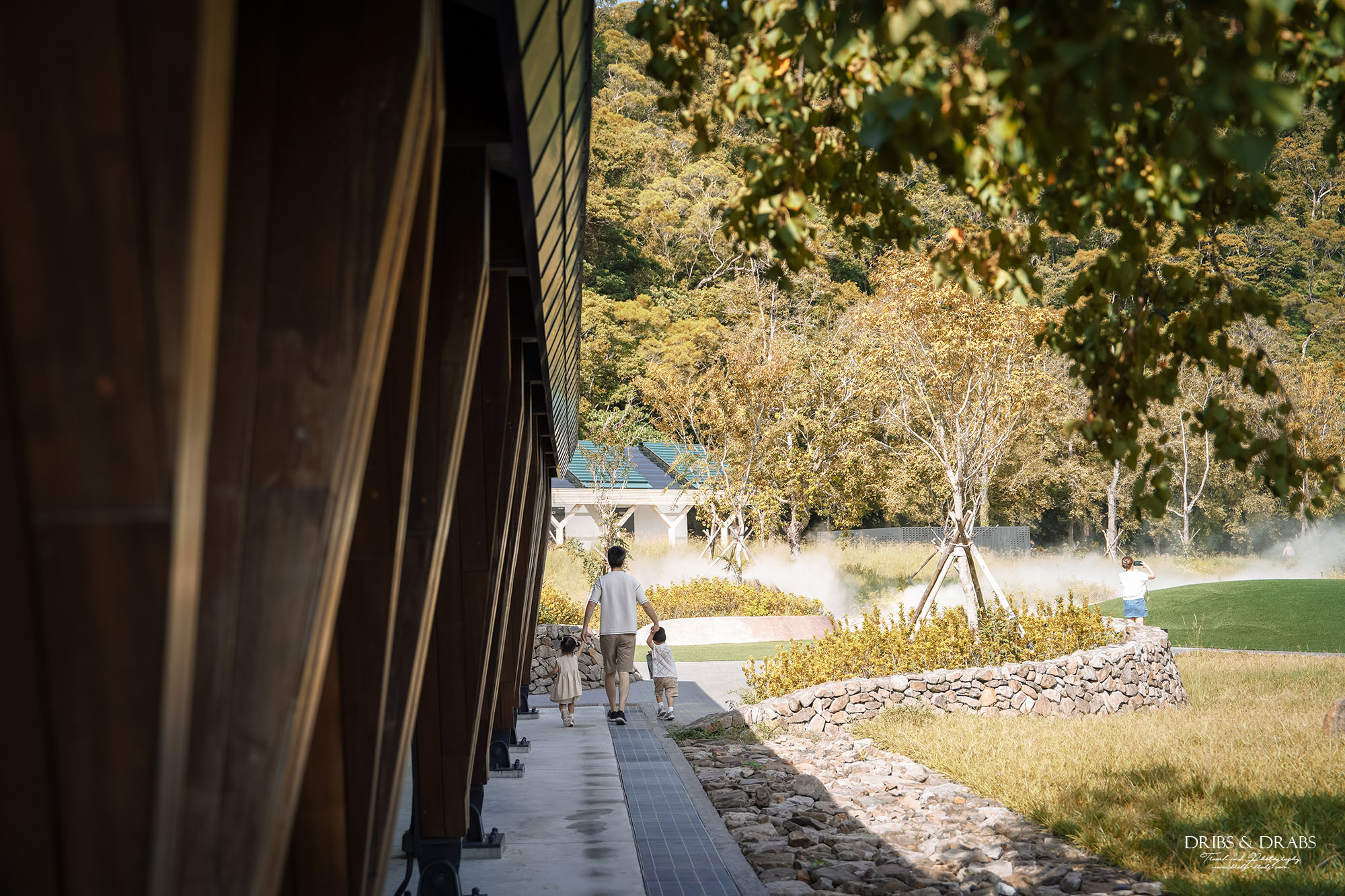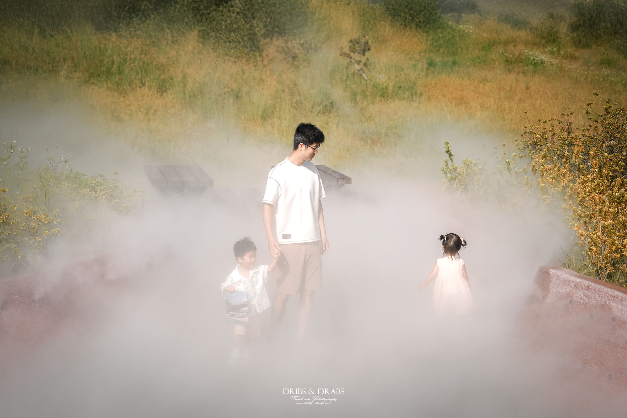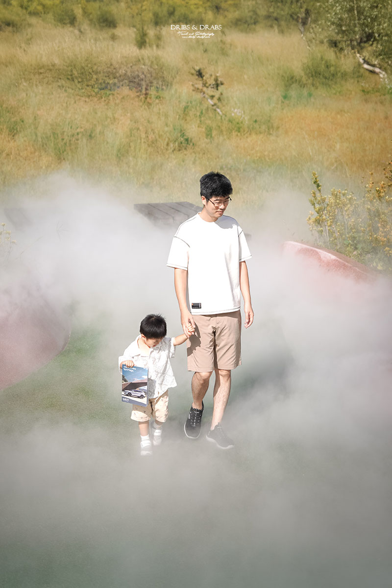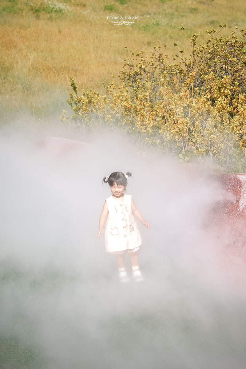 那時剛好遇上灑水噴霧啟動,細緻的水氣在陽光中化為朦朧的薄霧,光與知看見後立刻衝了進去,開心地穿梭其中。兩個小小的身影在霧氣裡笑著、跑著,我也趕緊拿起相機,記錄下這宛如夢境般的畫面。