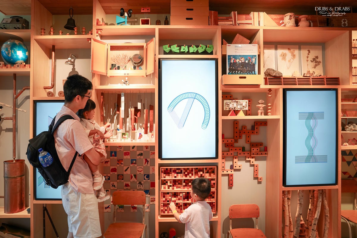 好不容易離開了花園,步入室內更讓我們驚豔,首先映入眼簾的是一整面木格子牆,每個格子裡都陳列著各式小物:有的是昔日中學校遺留下來的物件,如鈴鐺、燈具等,帶著歲月的痕跡;有的則是由舊木桌椅重新改造的積木與裝飾,別具巧思。這面牆靜靜地訴說著中學校的往日時光,讓人駐足流連。