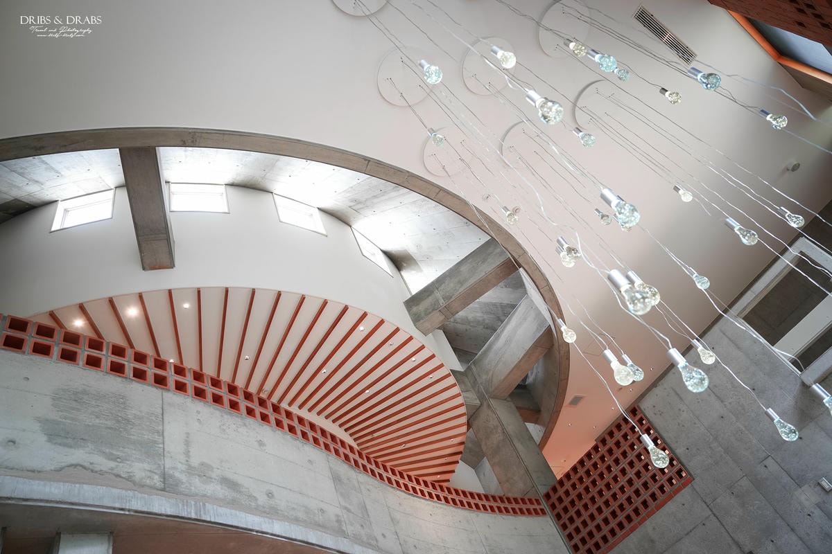 再往裡走,眼前展開的是一處挑高、光線流瀉的空間。陽光透過巨大的落地玻璃灑落進來,與色彩瑰麗的馬賽克玻璃交織,折射出斑斕的光影。原有的中學校建築本就獨具特色,如今經過細緻的佈置與點綴,更加地迷人呀!