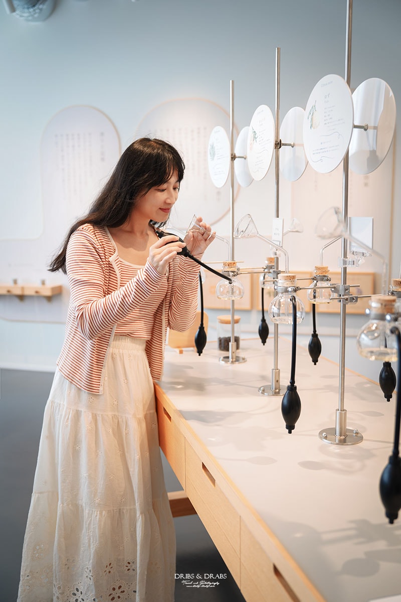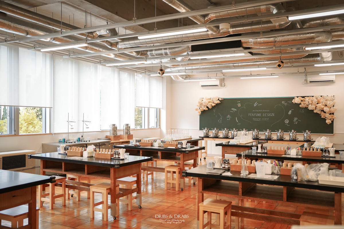 其中一間舊教室被改造成香氛實驗室,裡頭整齊陳列著各式自然氣息的瓶罐。體驗的方式十分特別,只要輕輕按壓氣球,空氣噴出時,香氣同時在瓶口綻放。更貼心的是,此區還設置了小樓梯,讓孩子們也能輕鬆參與其中,一起感受這場氣味的探索旅程。