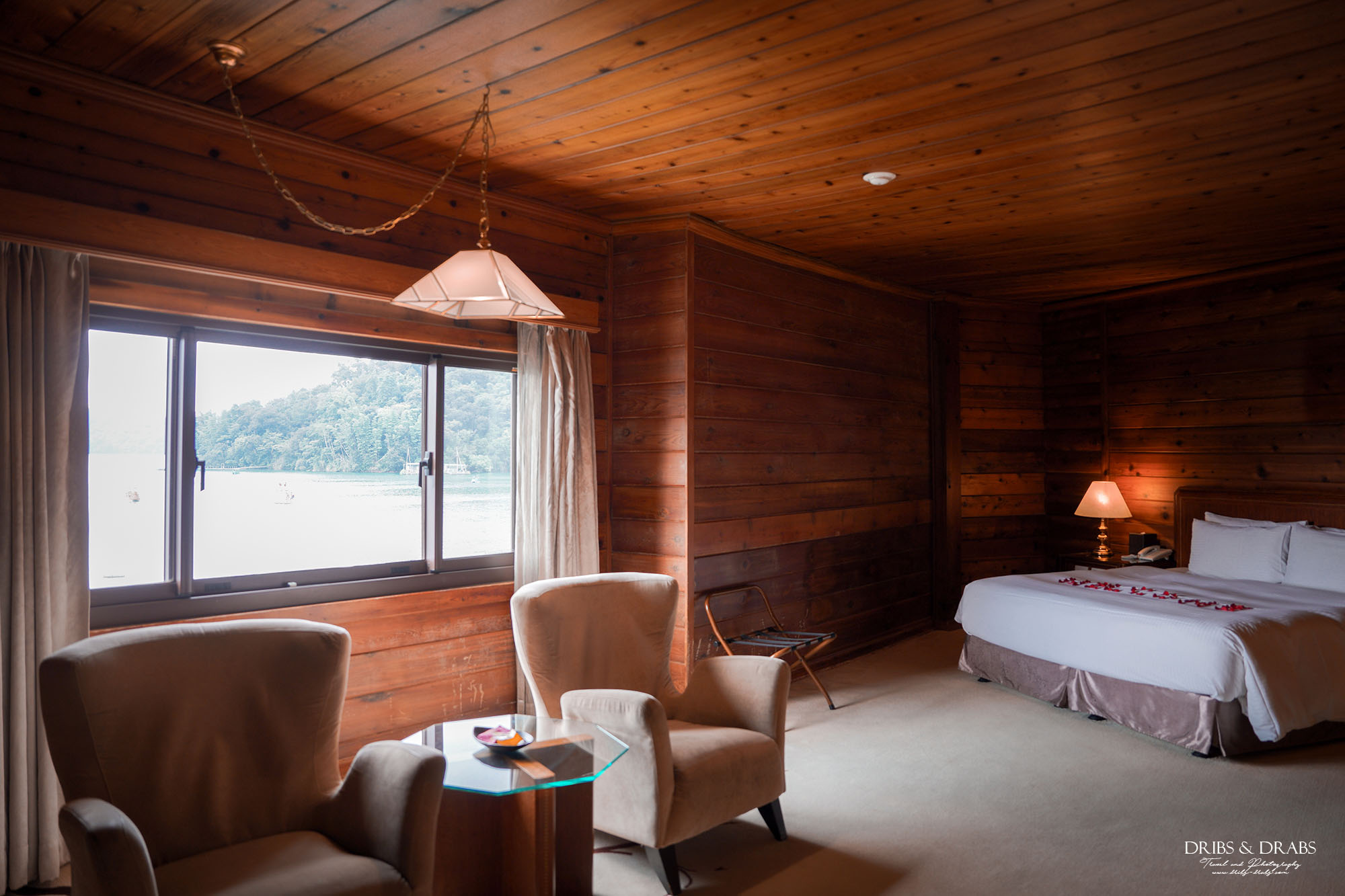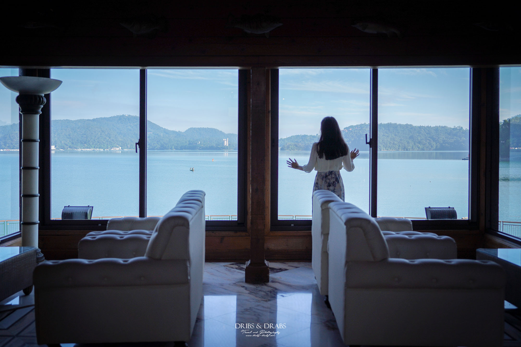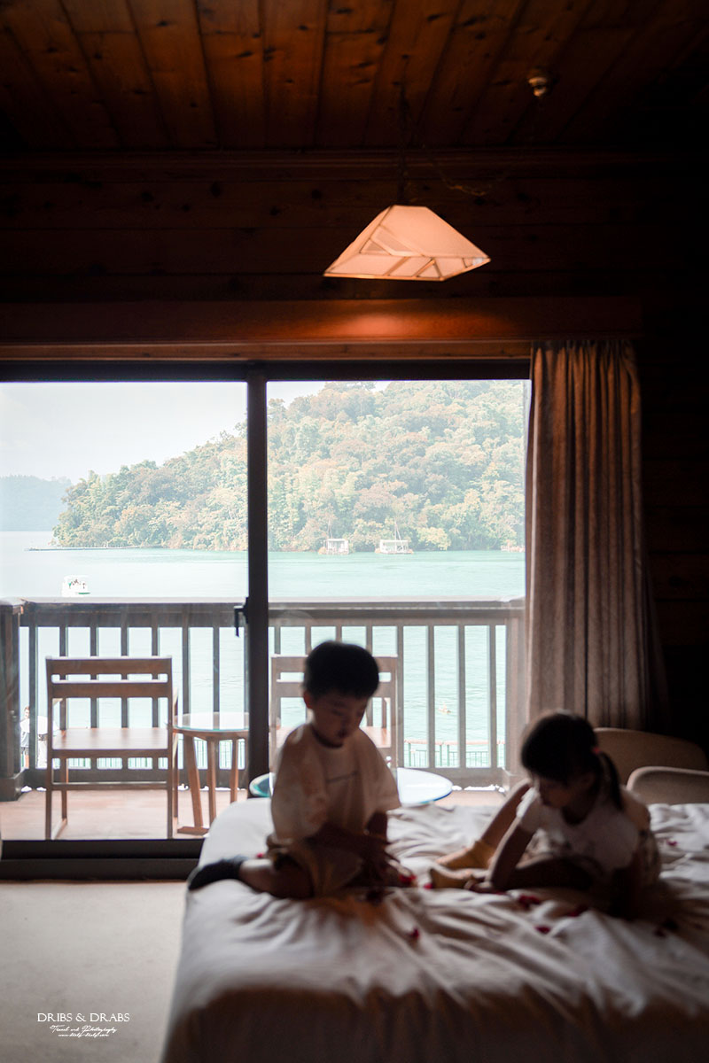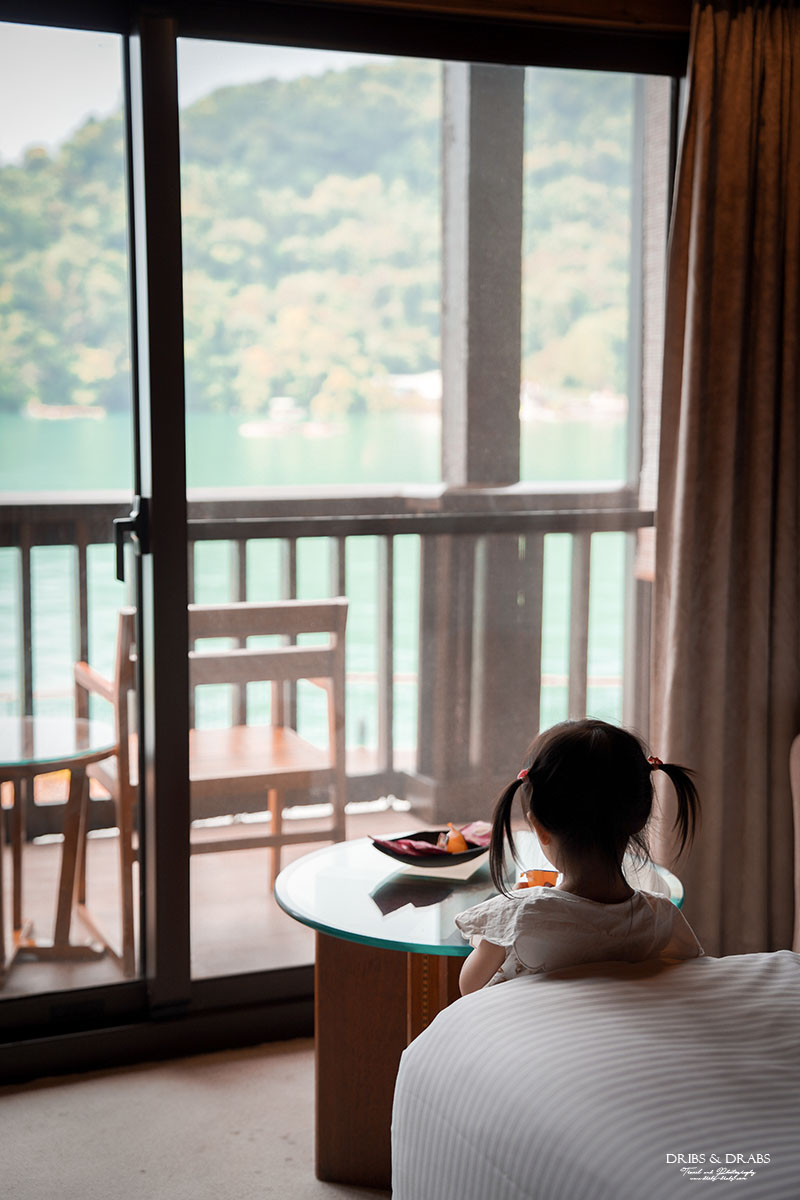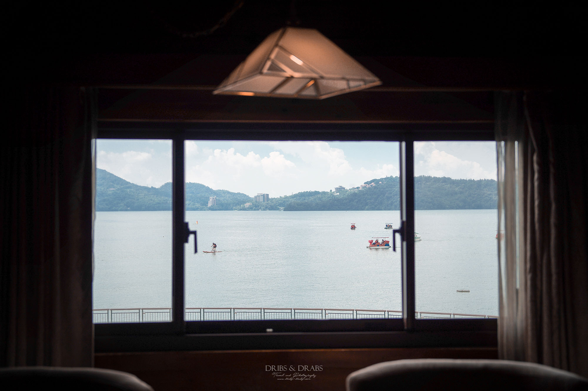 雖然房型位在三樓,不是特別高的樓層,但在陽台看到的180度湖景已令人非常難忘。正前方是壯麗的大山大水、左側是伊達邵碼頭全景、右側則是日月潭纜車站,飽覽日月潭風光。