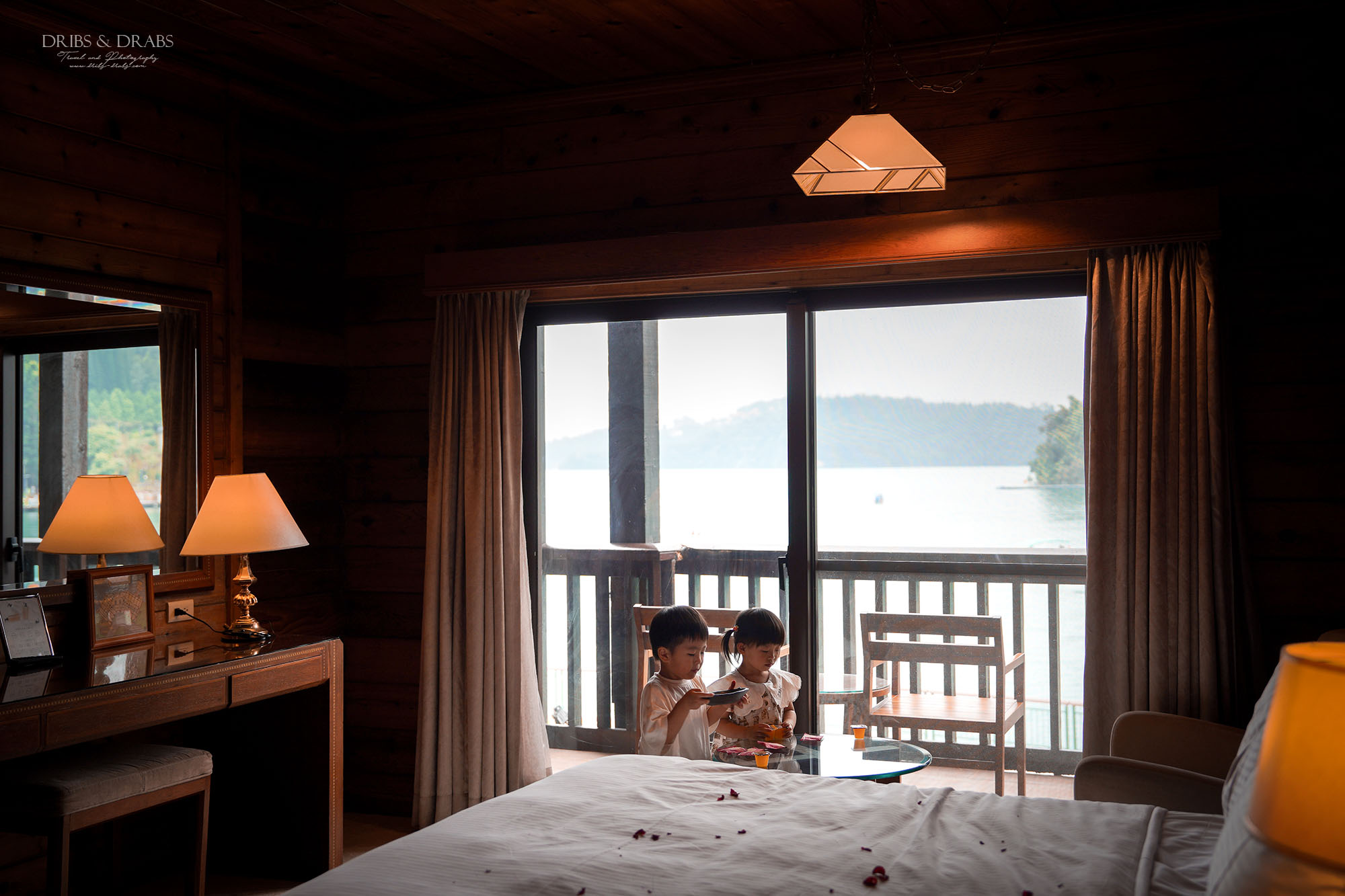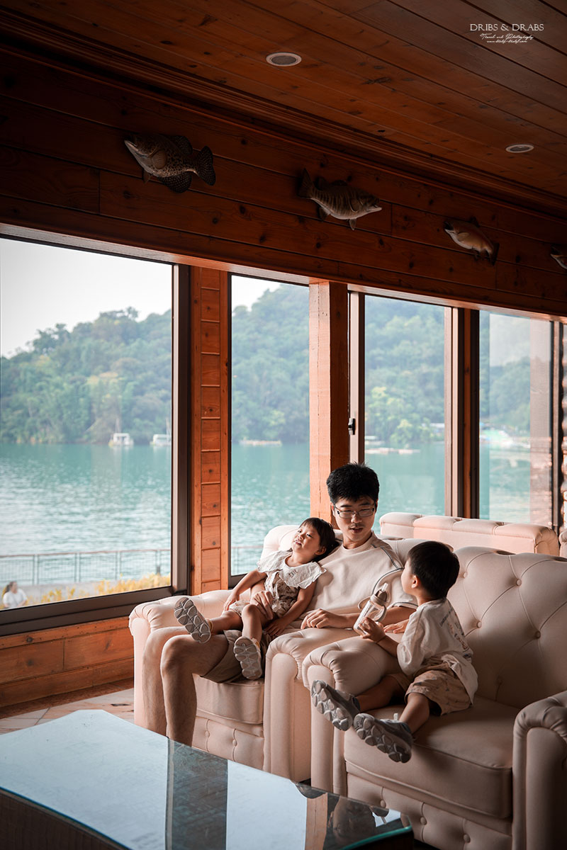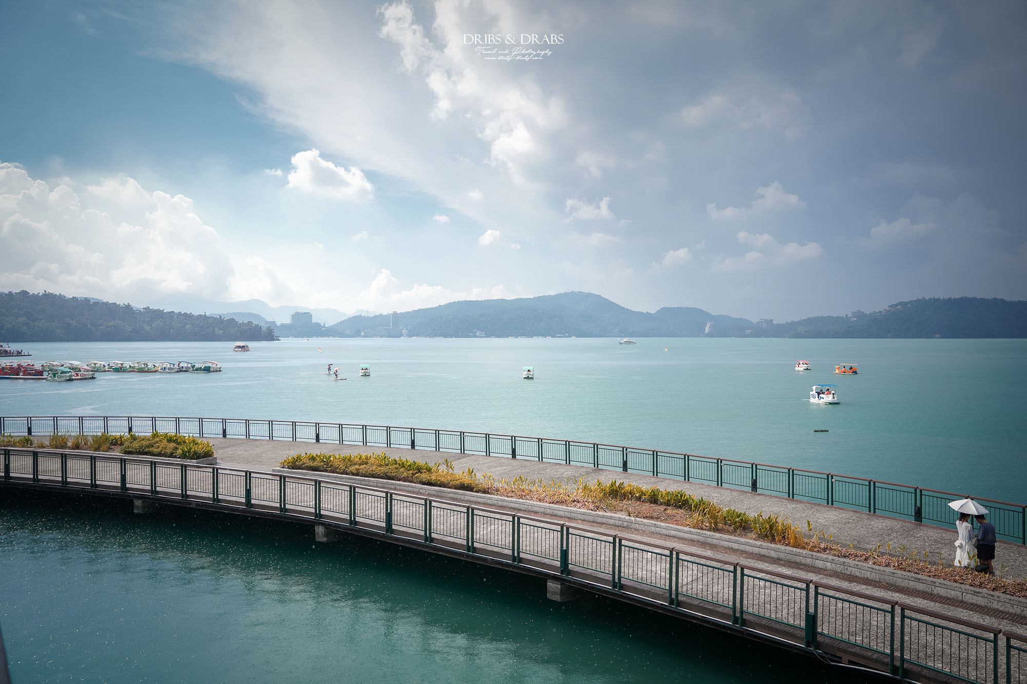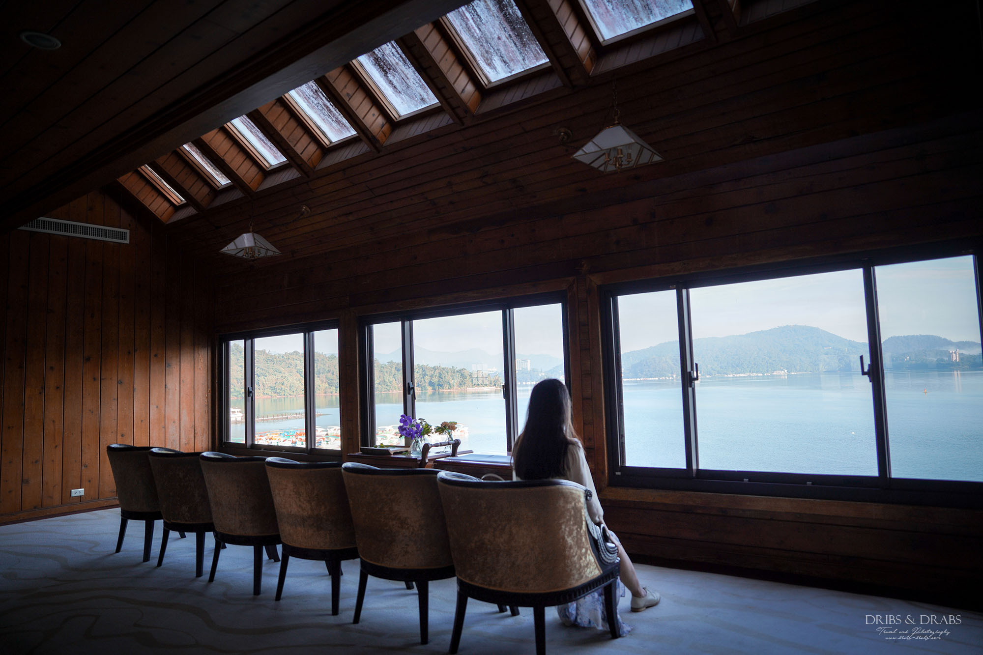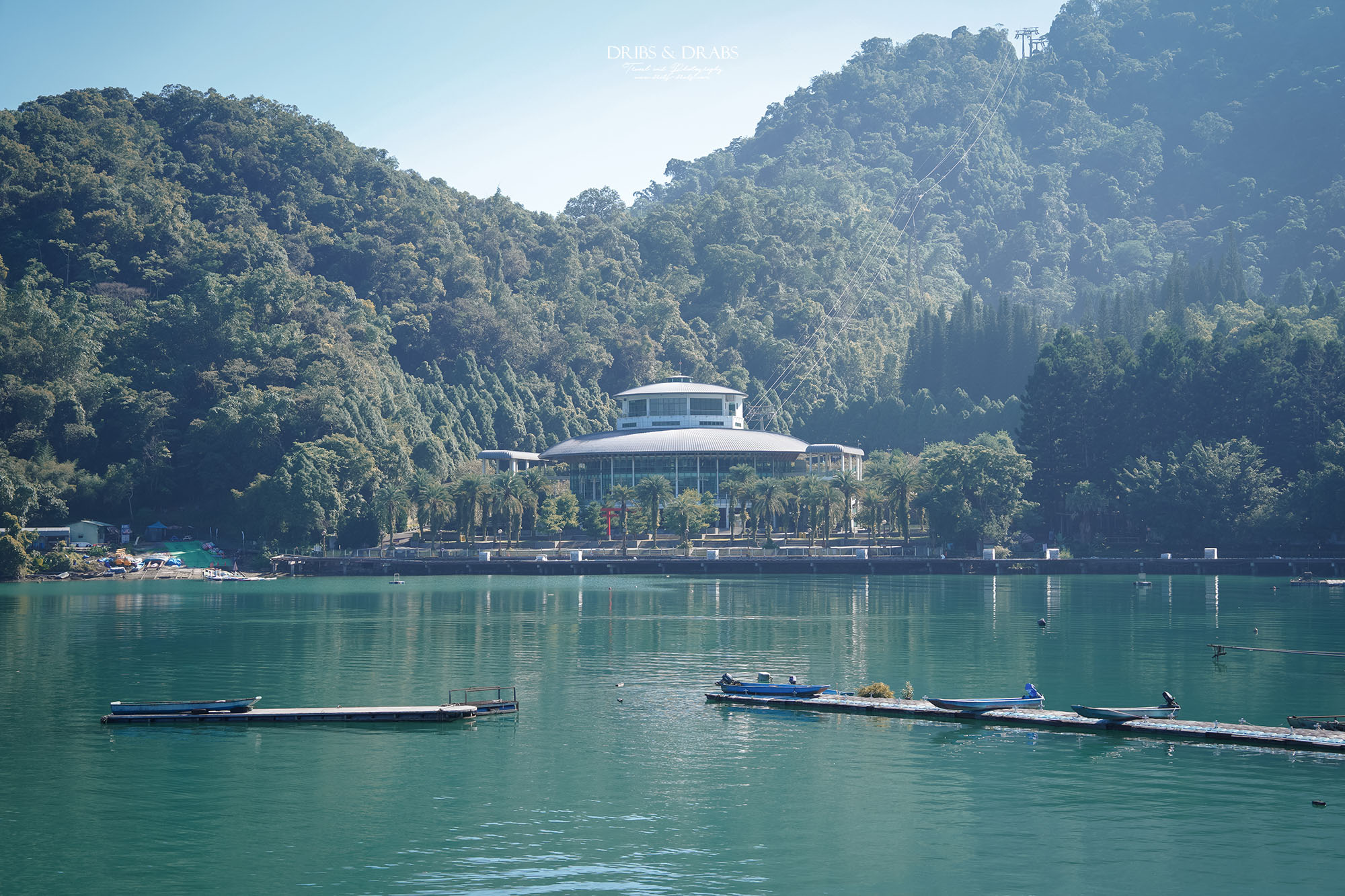 雖然房型位在三樓,不是特別高的樓層,但在陽台看到的180度湖景已令人非常難忘。正前方是壯麗的大山大水、左側是伊達邵碼頭全景、右側則是日月潭纜車站,飽覽日月潭風光。