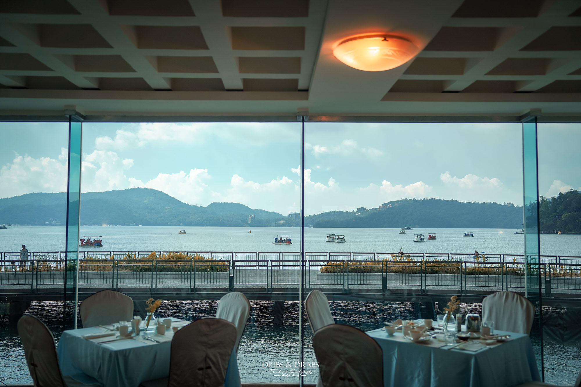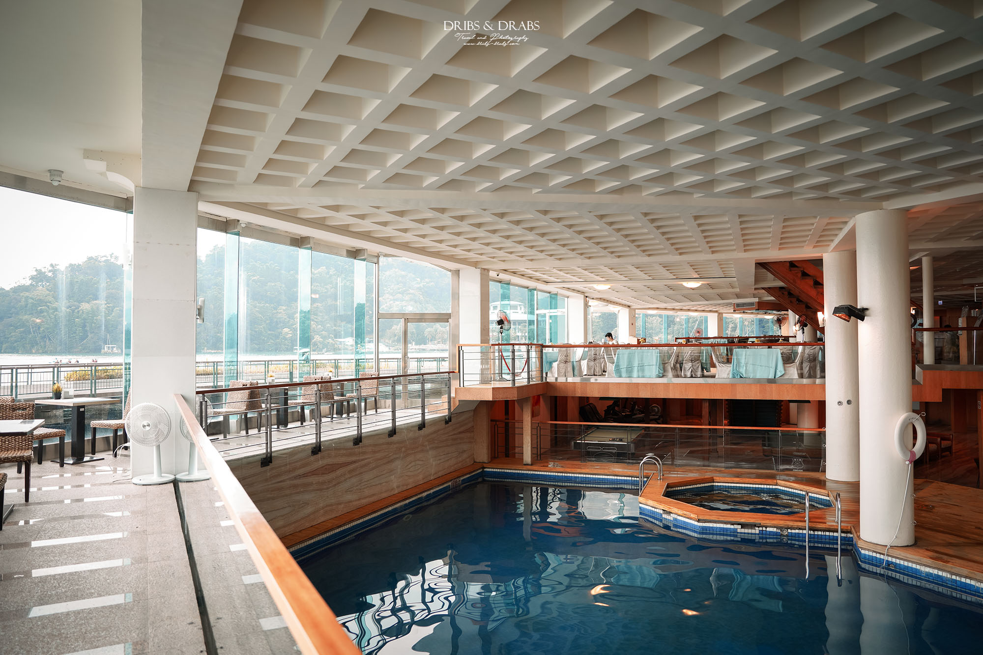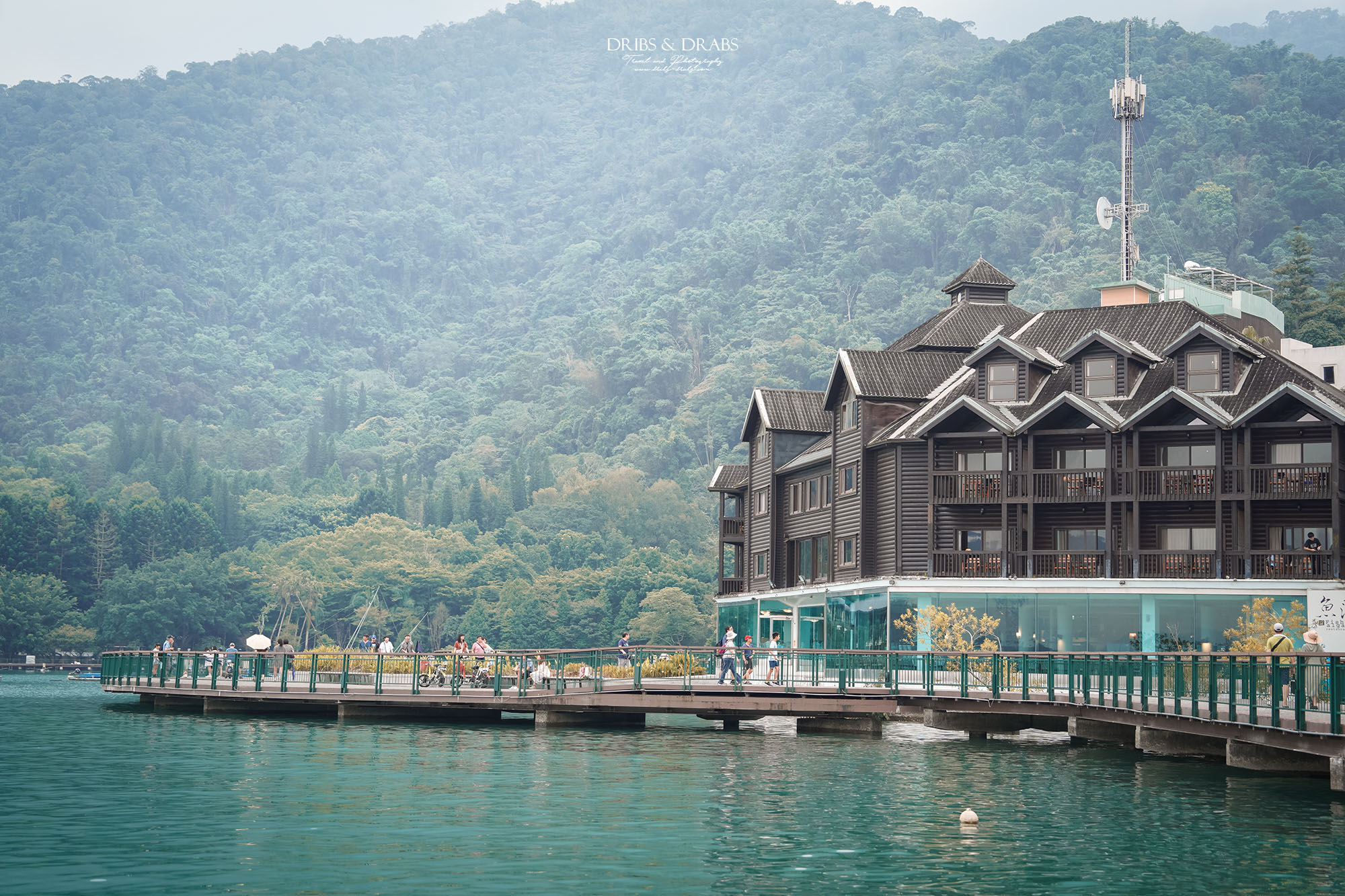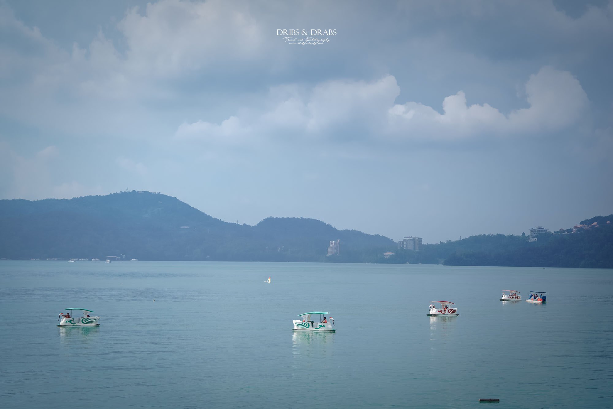 雖然房型位在三樓,不是特別高的樓層,但在陽台看到的180度湖景已令人非常難忘。正前方是壯麗的大山大水、左側是伊達邵碼頭全景、右側則是日月潭纜車站,飽覽日月潭風光。