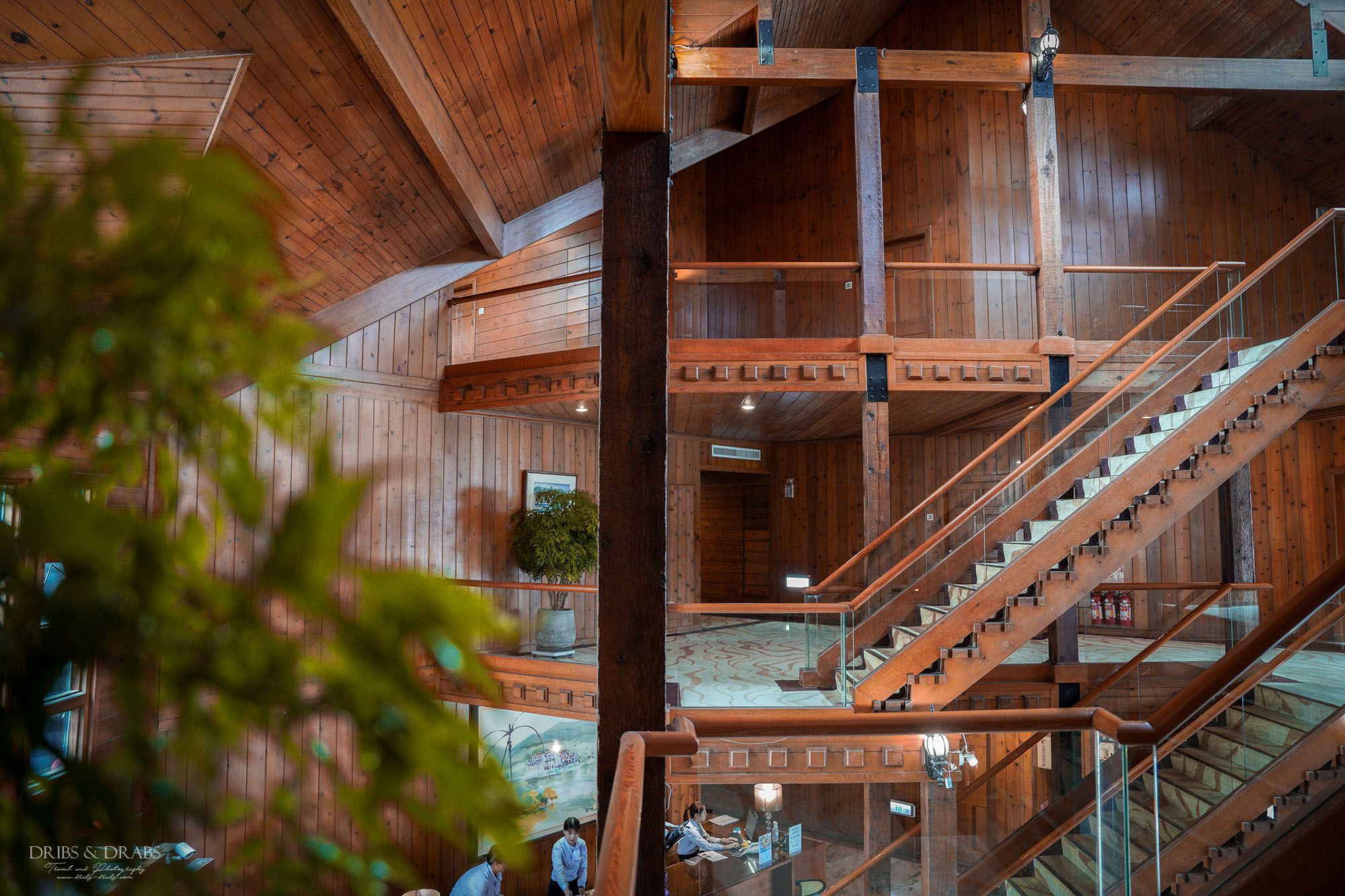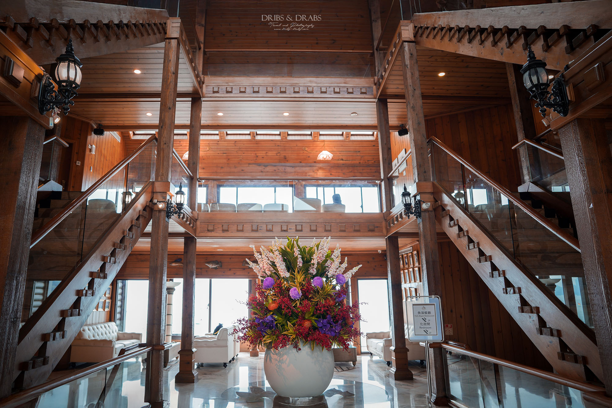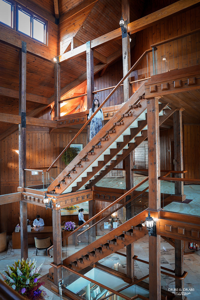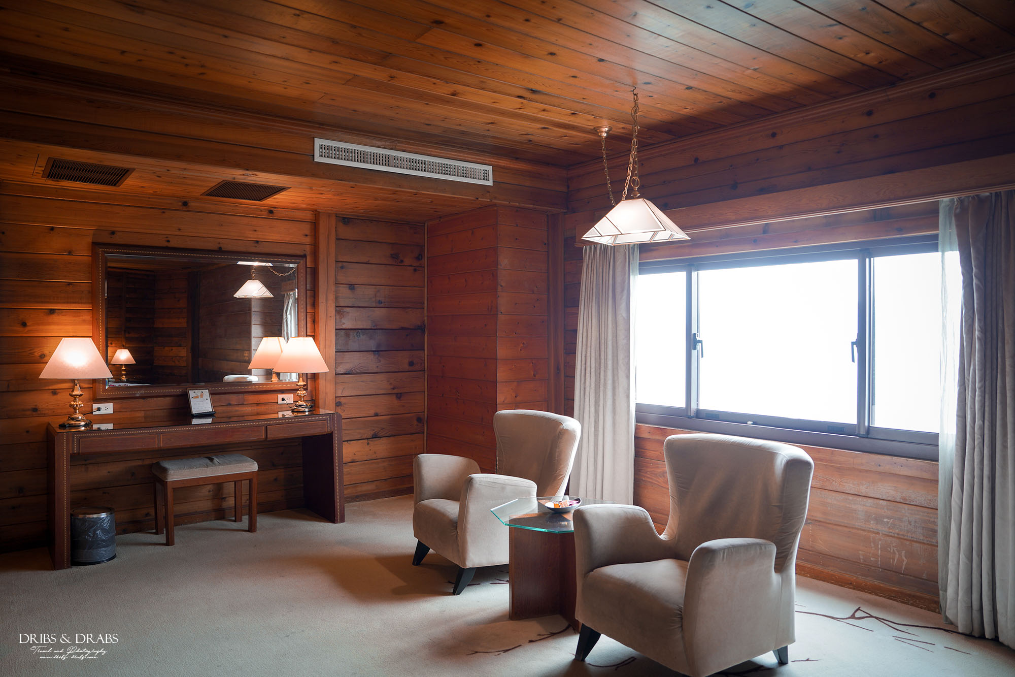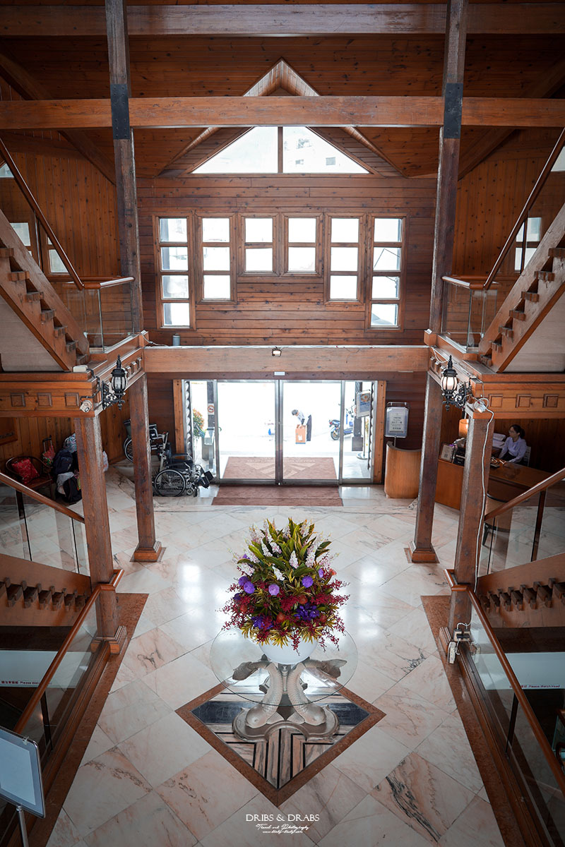步入飯店大廳,迎面而來的是淡雅的木頭清香,配上溫潤的木質色調與挑高結構,既壯觀又充滿溫度。「儷山林會館」共有五層樓,一進門即為三樓大廳,客房分布於三、五、六樓,二樓為魚藻餐廳,一樓則是泳池與SPA等休閒設施。由於全棟為木造結構,未設電梯,但接待人員會協助搬運行李。若有行動不便者,建議致電預約三樓客房,方便進出。
