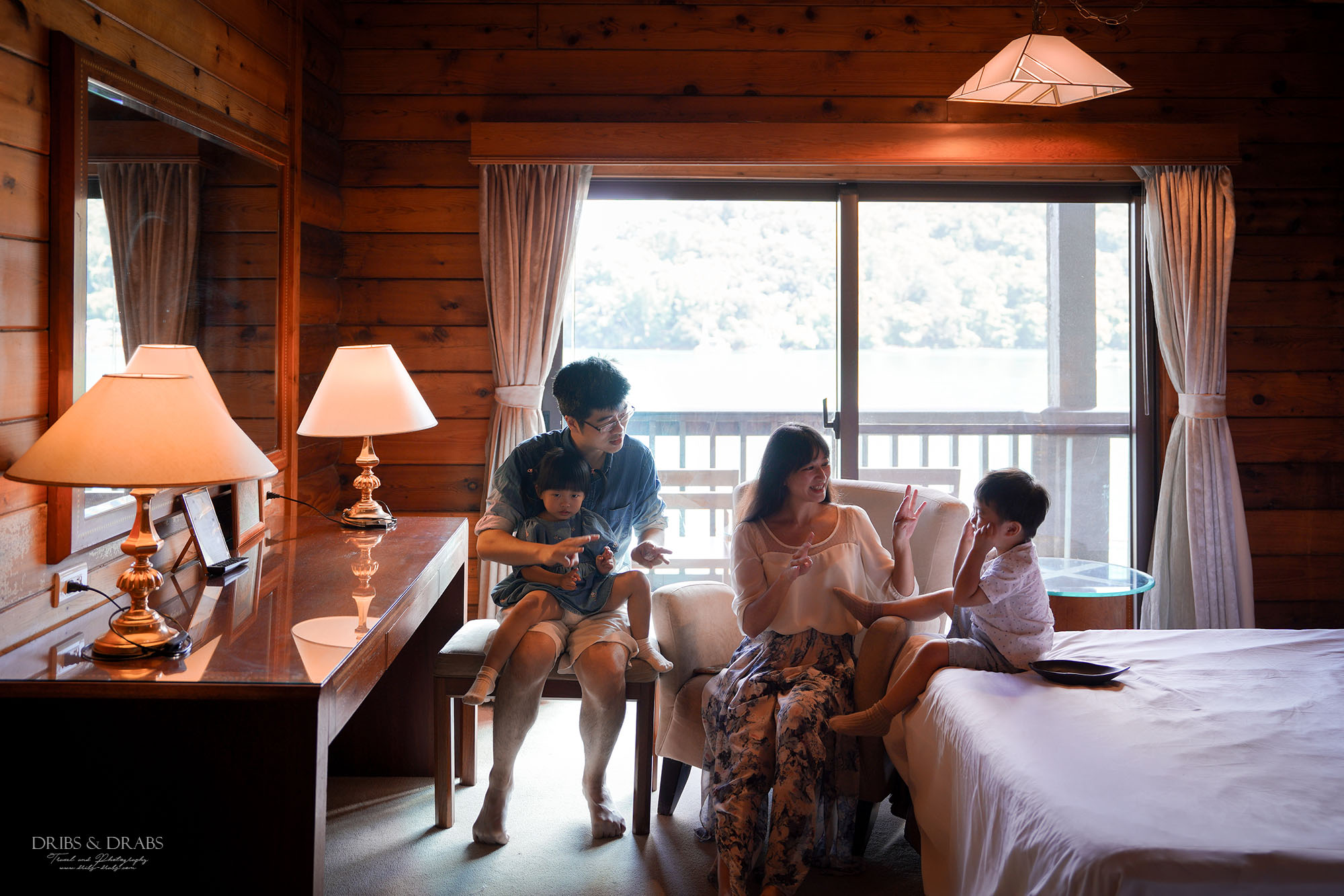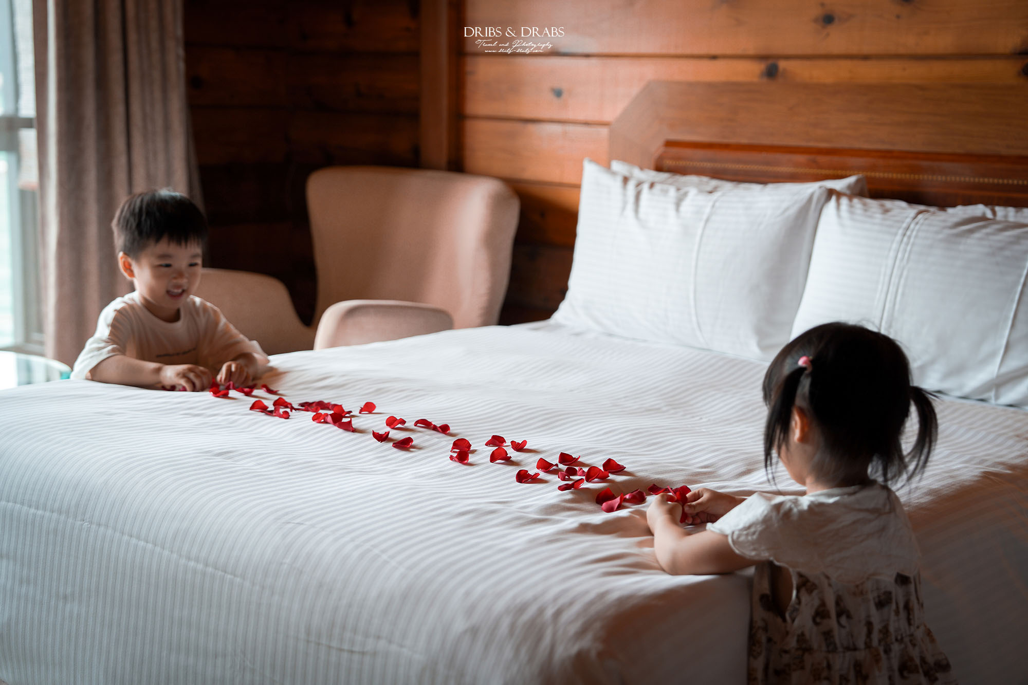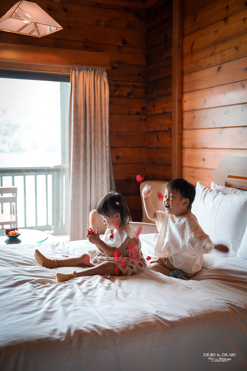這次入住的是三樓的「豪華湖景四人房」,設有兩張舒適雙人床與面湖陽台。房內以木質調為主軸,搭配淺米色地毯、窗簾與沙發,氛圍溫潤而典雅。打開窗簾,映入眼簾的是無遮蔽的日月潭全景,湖面波光粼粼,宛如一幅會呼吸的畫作。令人驚喜的是,房內其中一張床鋪上了浪漫的玫瑰花瓣迎賓,小朋友看到興奮不已,滿屋洋溢著幸福笑聲。