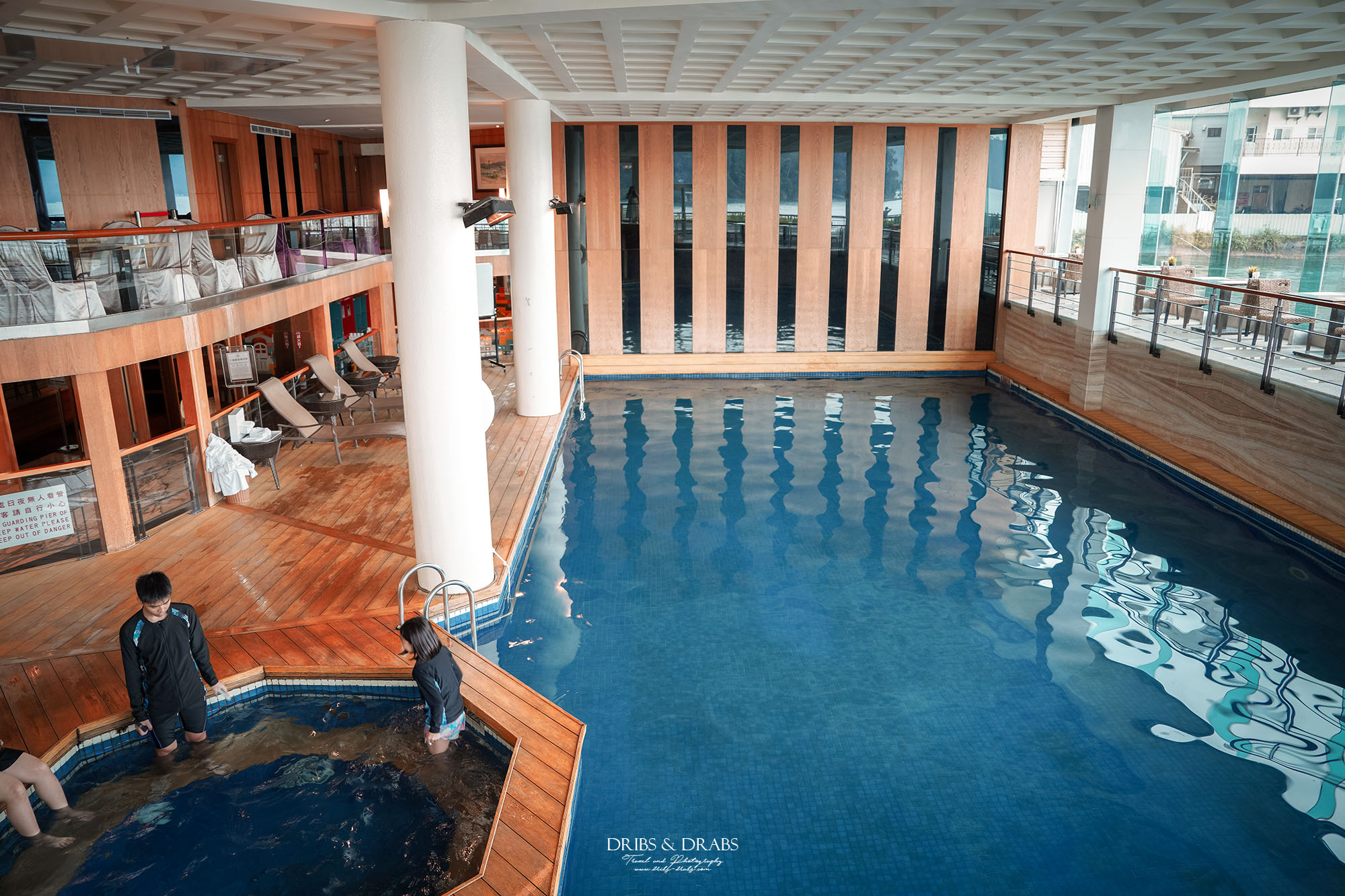 一樓的泳池區挑高與二樓的餐廳相連接,讓整個空間和視覺感更顯大器。其他公設還有三溫暖、健身房、和孩童專屬的球池。
