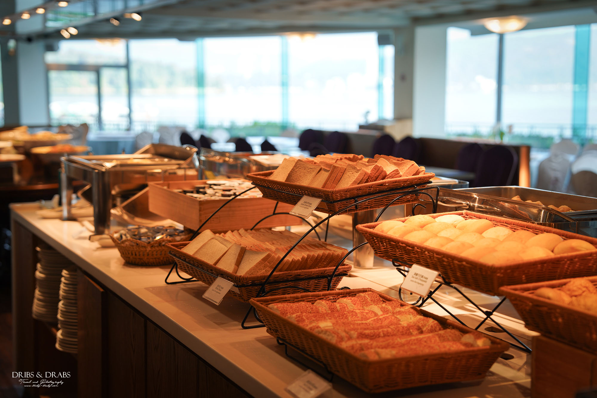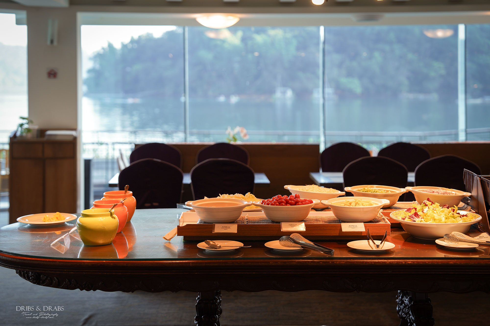 早餐在魚藻餐廳享用,是入住日月潭儷山林會館的一大享受。這裡採自助式餐點,菜色豐富多元,從清粥小菜、麵包沙拉到在地時蔬與熱食一應俱全,中西式口味都能滿足。坐在大片玻璃窗前,一邊品嚐早餐、一邊欣賞日月潭晨景,湖面在陽光映照下閃閃發光,讓人心情格外平靜愉悅。