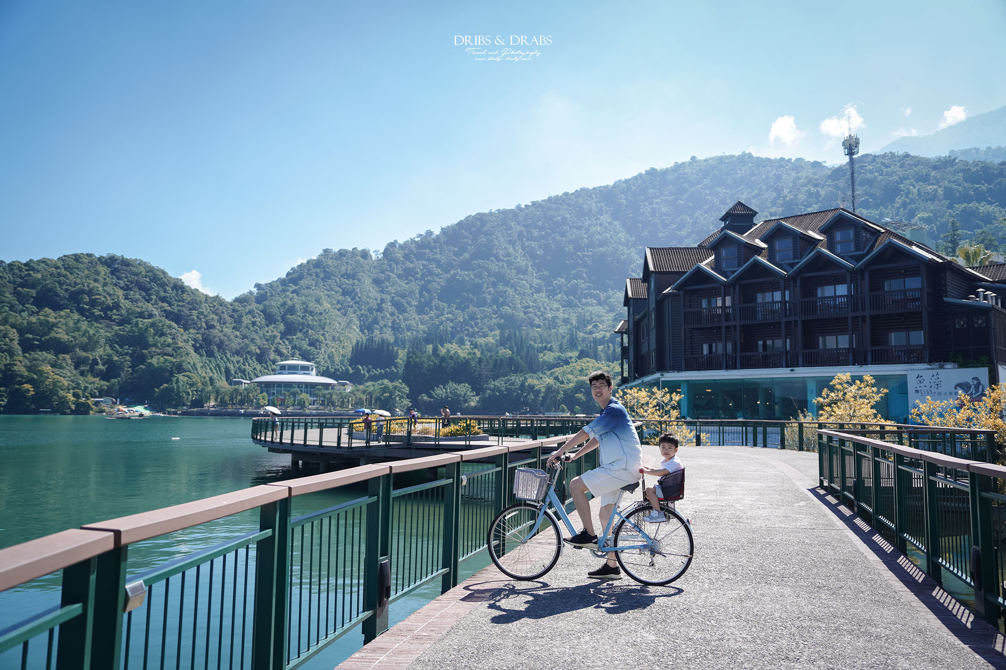 只要是住客,飯店都會贈送一張旅人自行車的兌換券,所有房客都可以在車行免費使用腳踏車一小時,也可以加價升級成電動腳踏車。因為旅人自行車行沒有提供一般親子腳踏車,只有親子電動腳踏車,所以後來決定到對面車行租親子腳踏車。早晨沿著湖畔步道騎乘涼爽又幸福滿滿,騎到纜車站都還算平穩輕鬆,但纜車站後的路段上上下下,載著知有幾段路我已經力不從心,後悔沒有租電動腳踏車了!女生若有載小孩,建議租電動腳踏車,男生可以騎一般自行車就好。